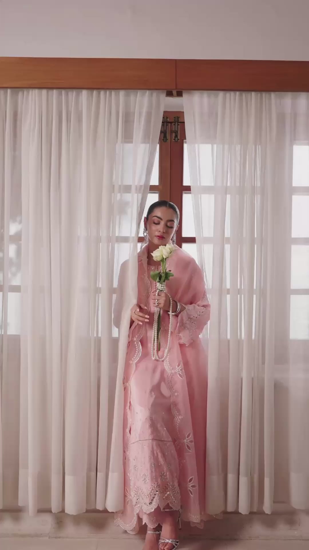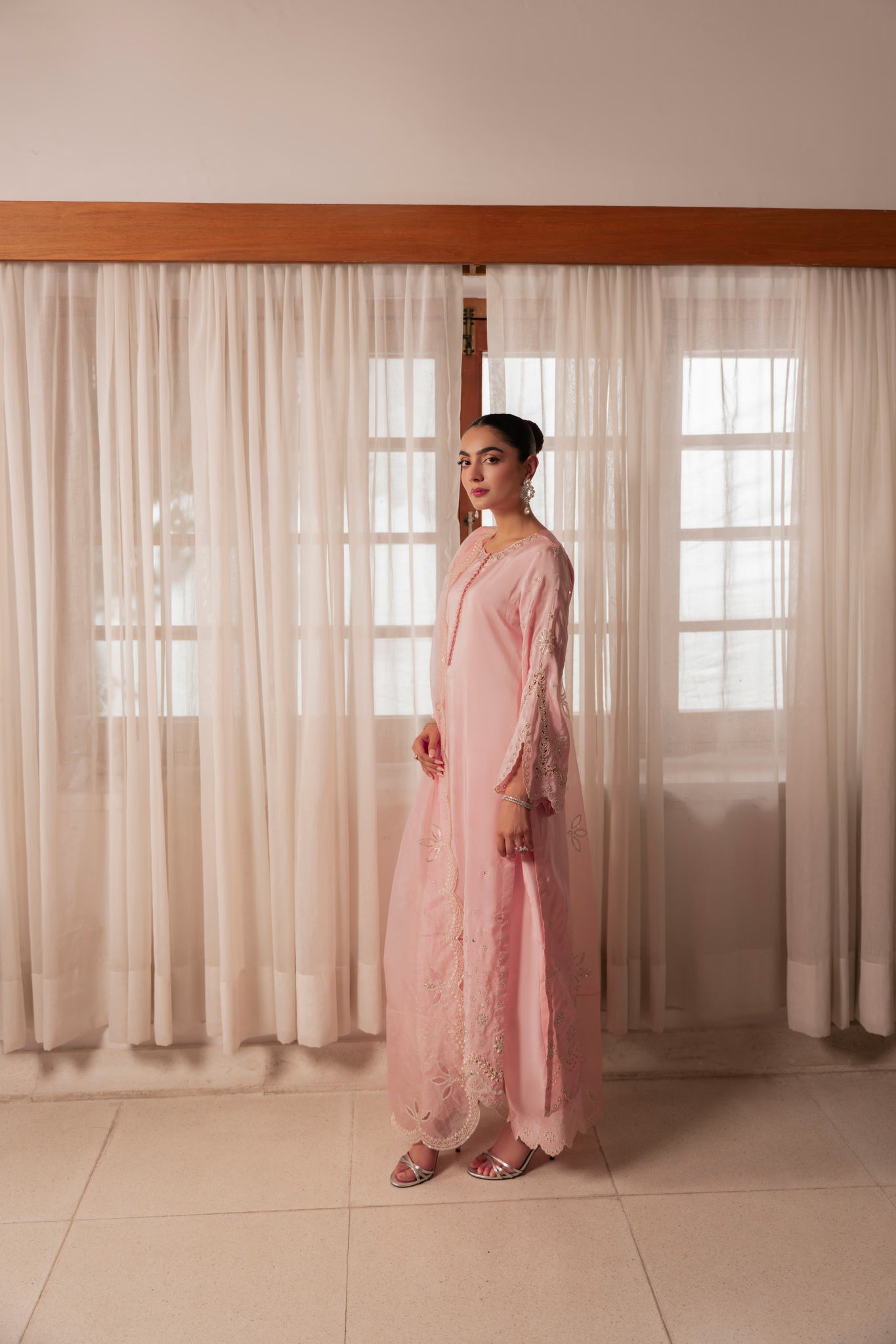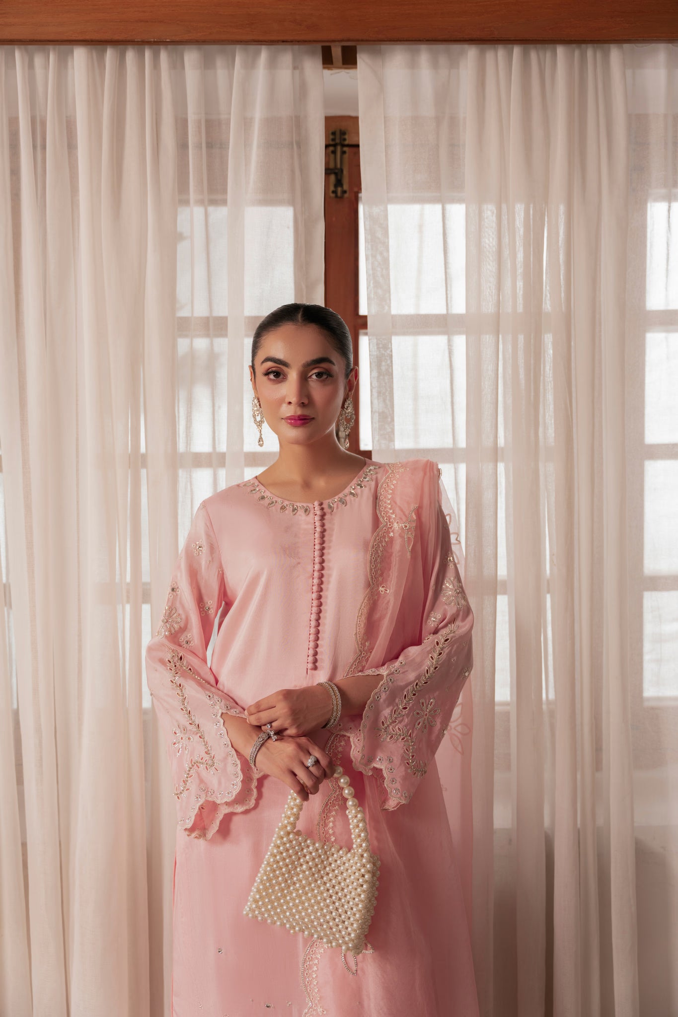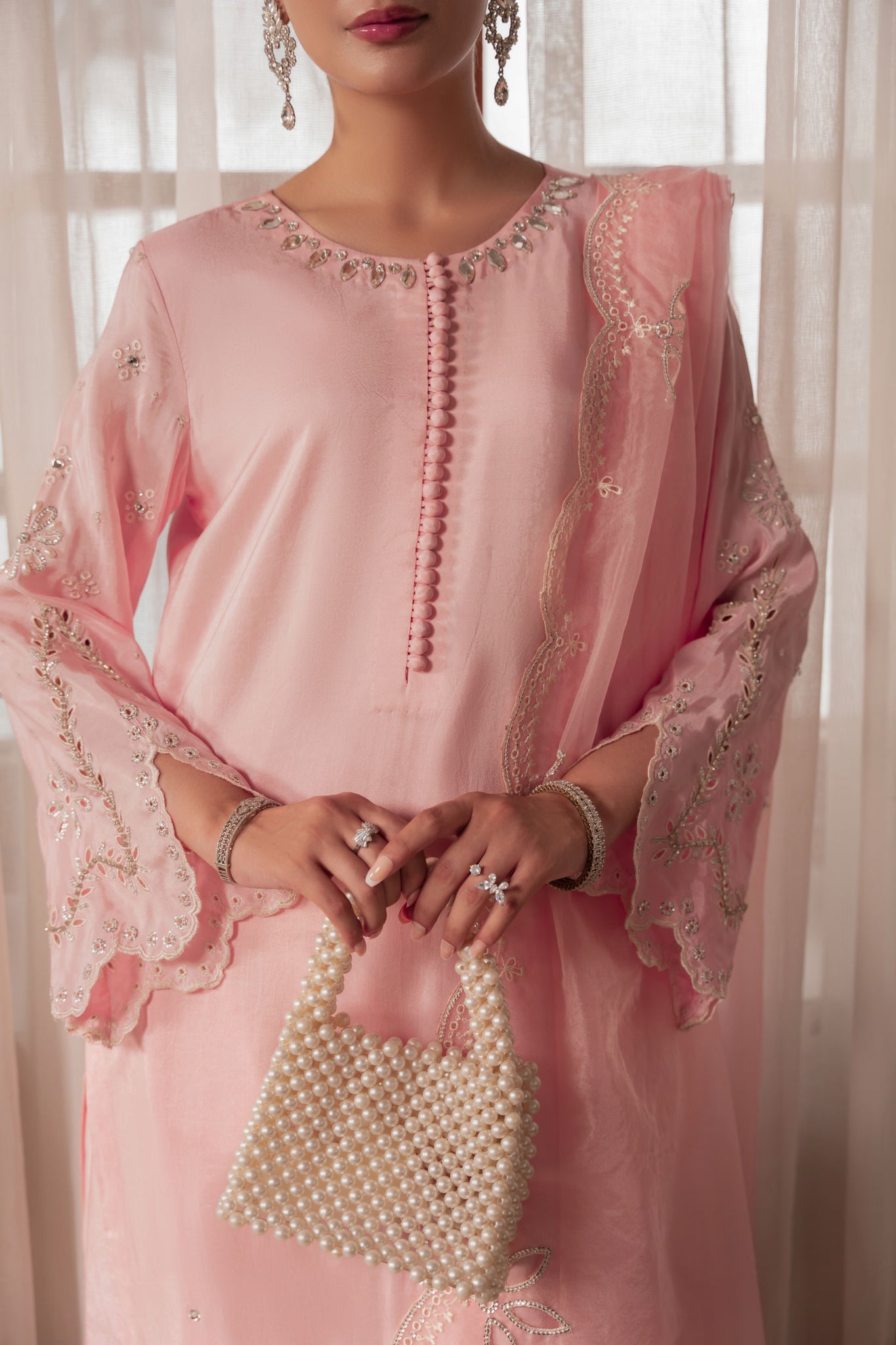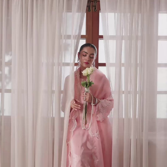 Graceful loop button detailing enhances its timeless femininity, while matching embroidered pants mirror the artistry. The look is completed with an ethereal organza dupatta featuring scalloped, sequin-embroidered borders and exquisite cutwork — a perfect harmony of sophistication and grace.