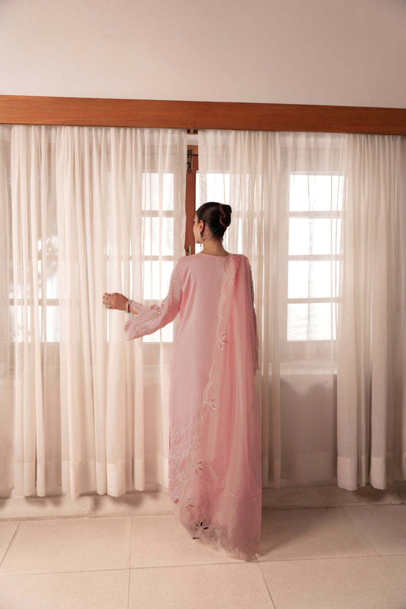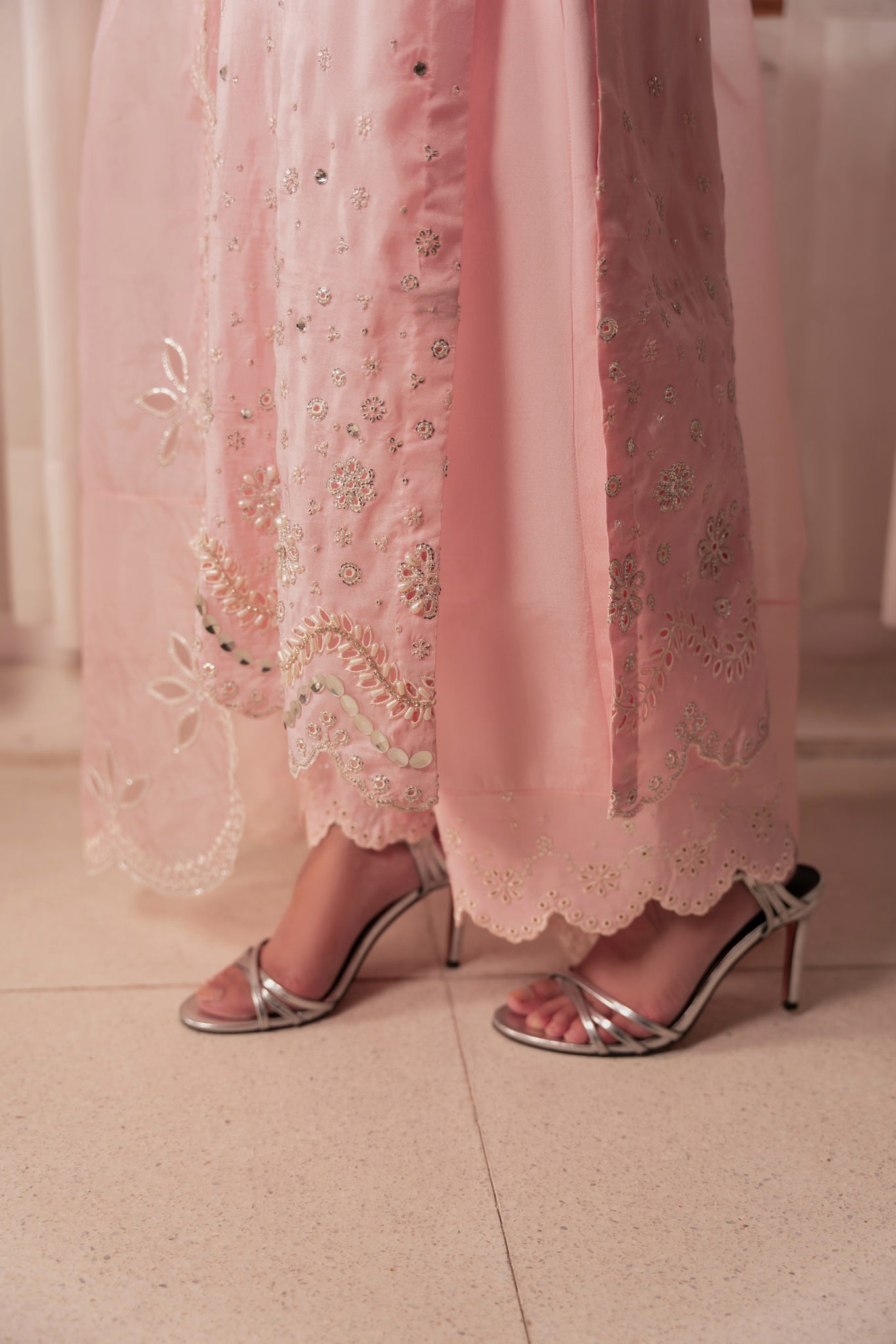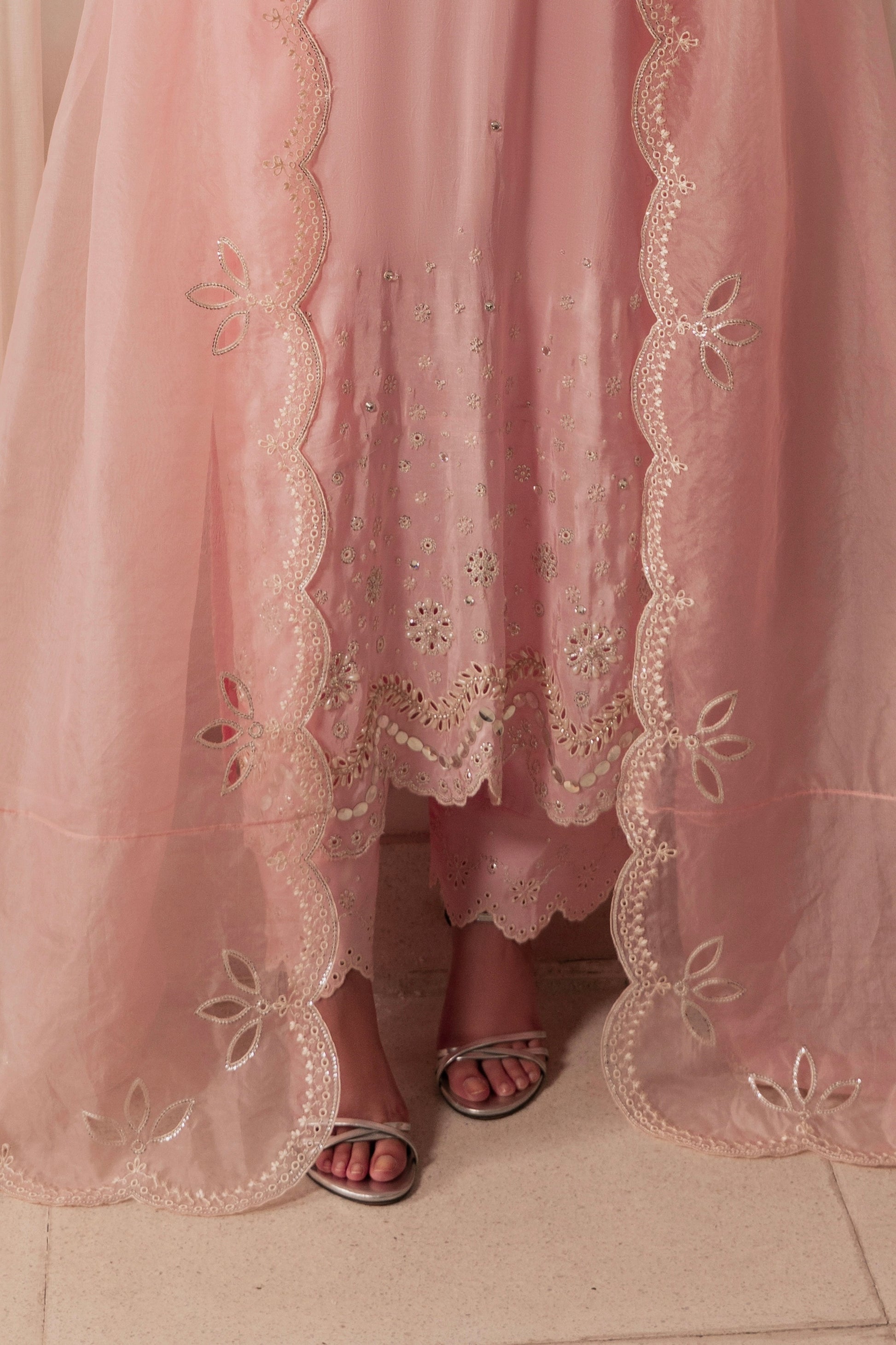 - Dupatta: Organza dupatta with scalloped and sequinned Embroidered borders with cutwork.