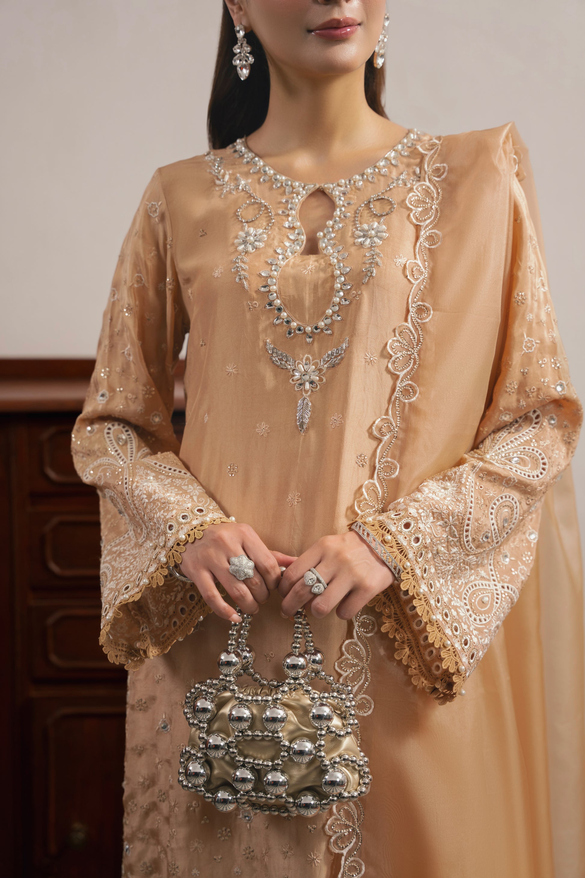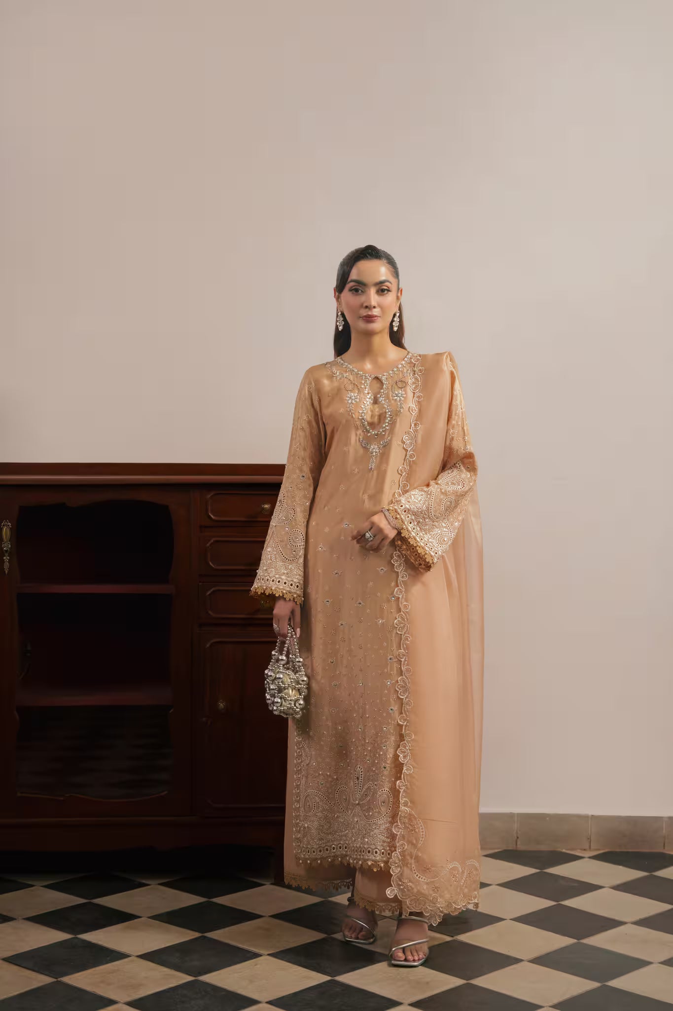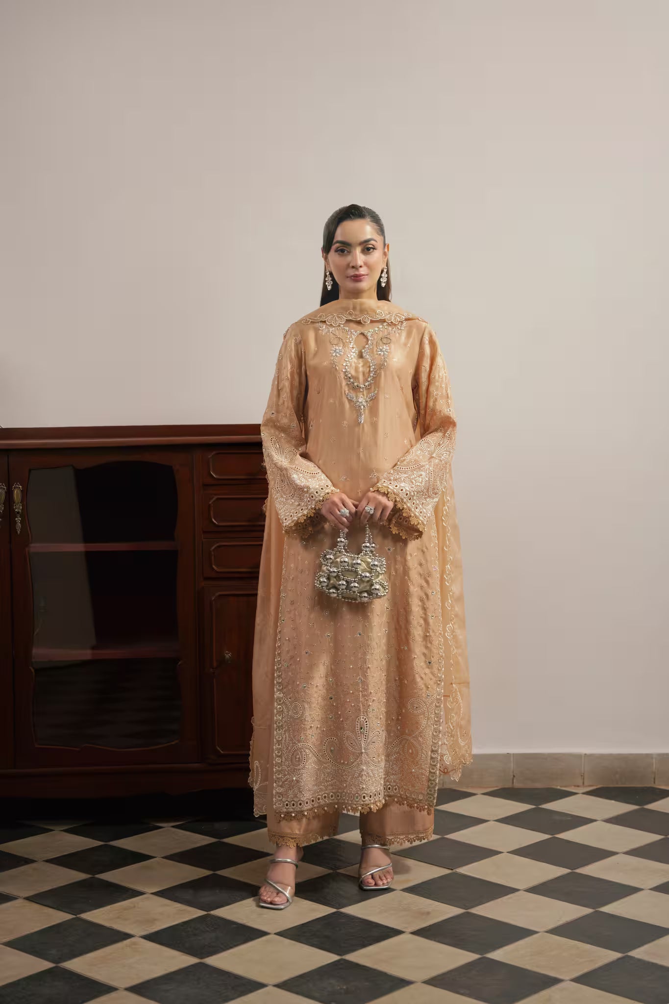 Paired with matching pants and an organza dupatta finished with scalloped, sequin-embroidered borders and delicate schiffli work — COCO embodies understated luxury and timeless grace.