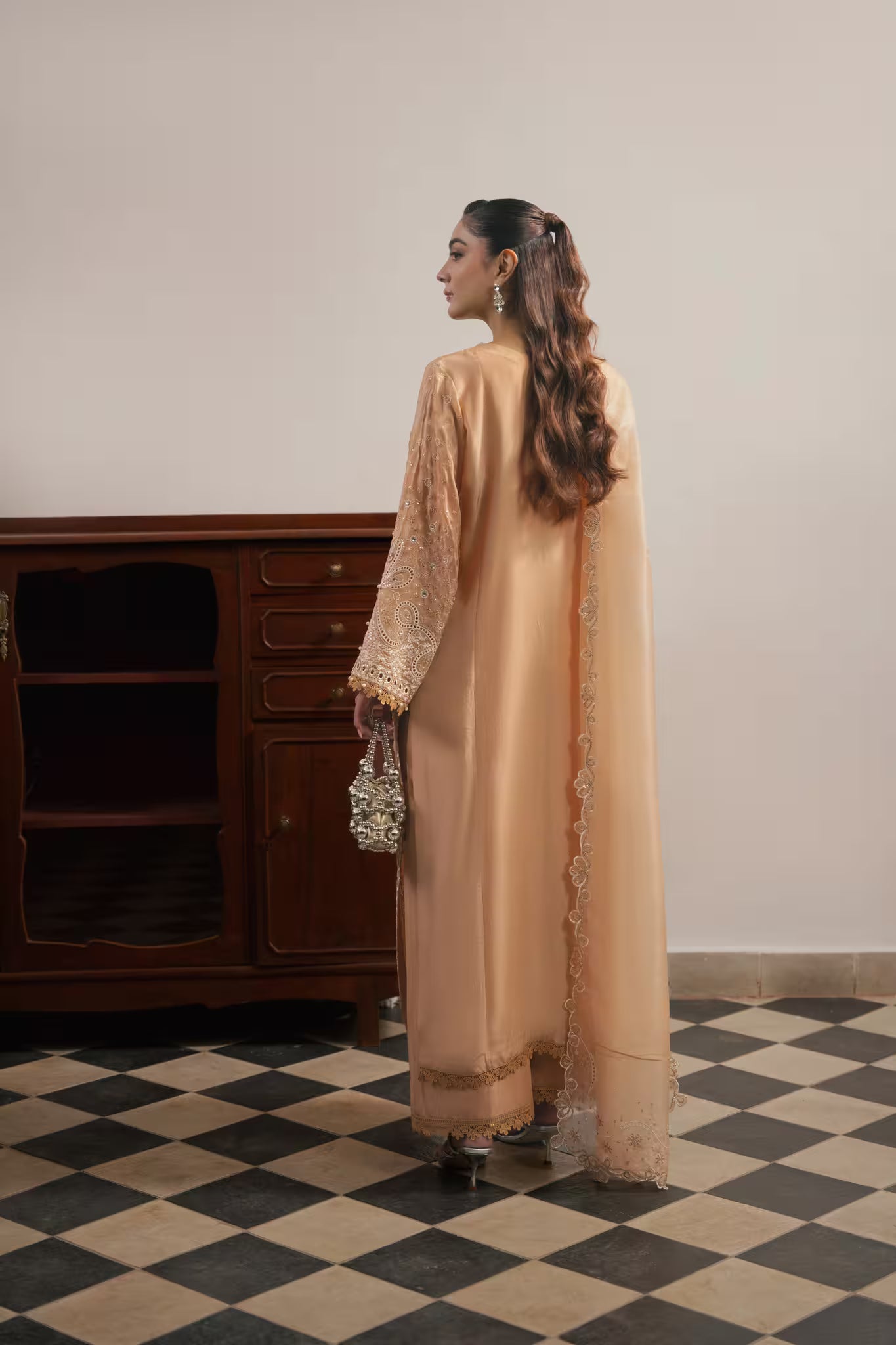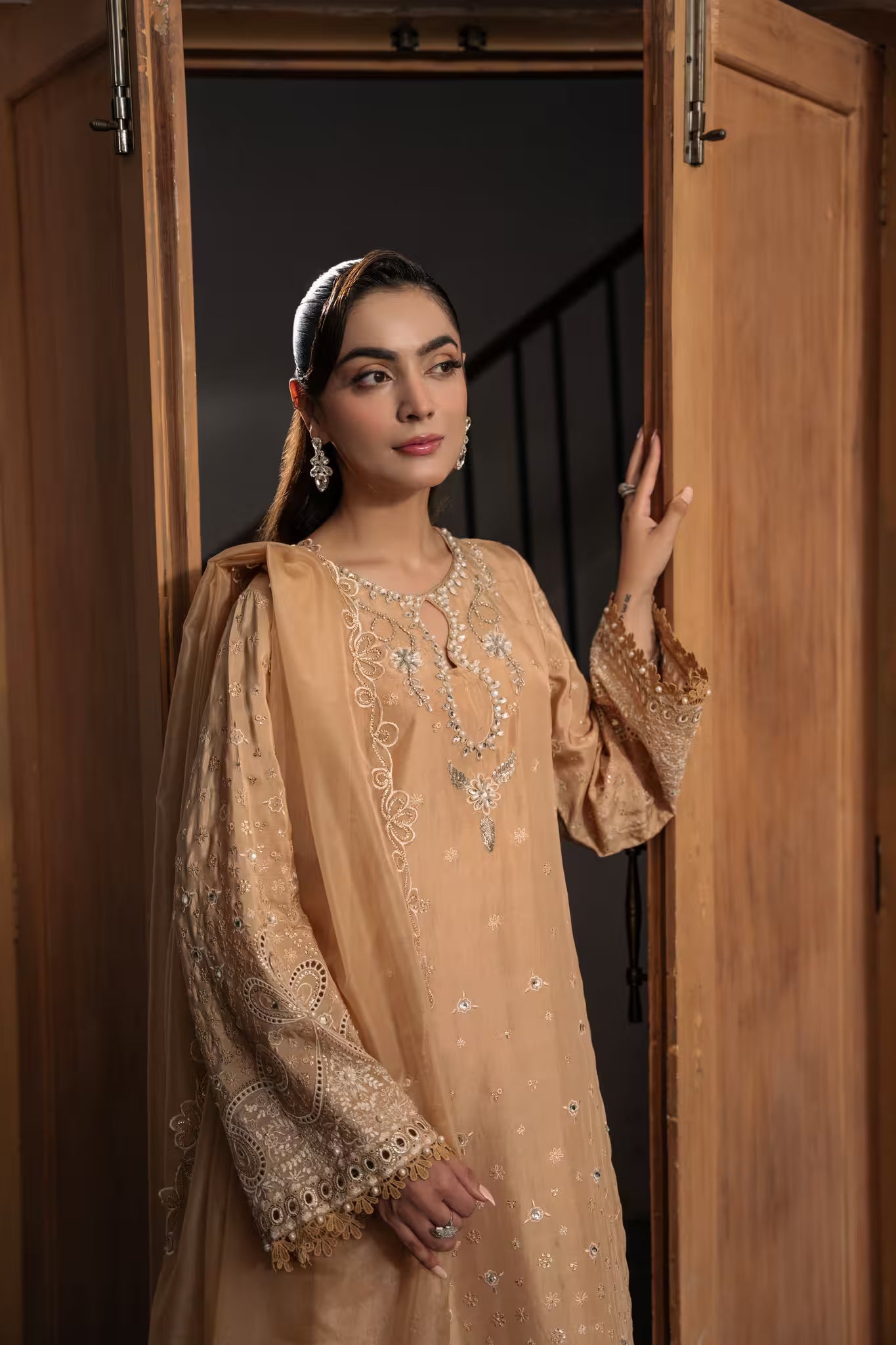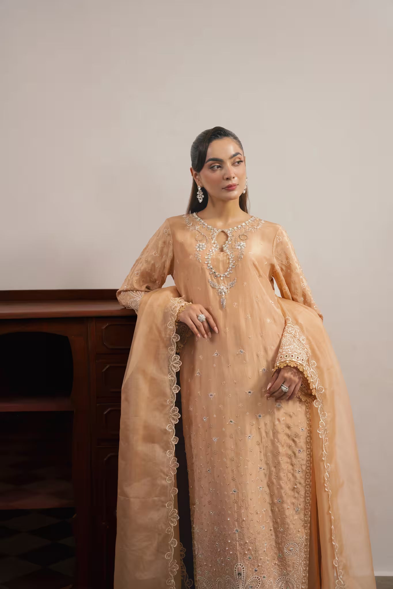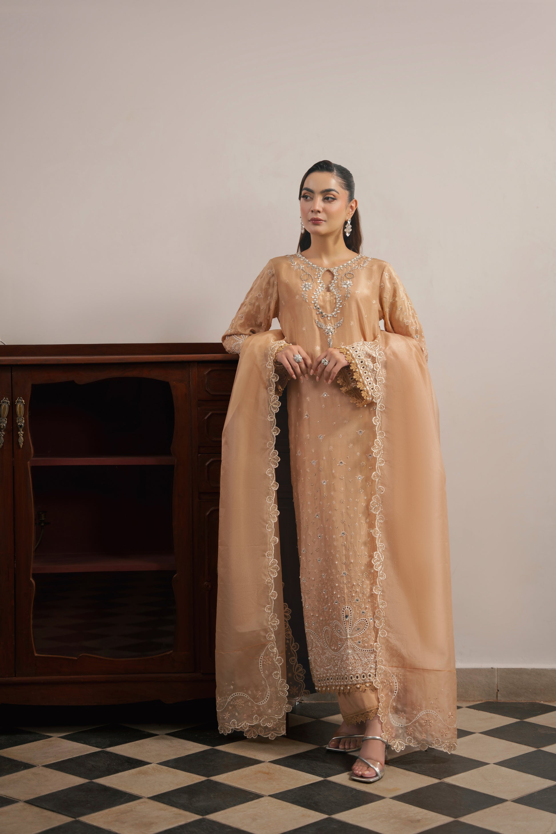 Paired with matching pants and an organza dupatta finished with scalloped, sequin-embroidered borders and delicate schiffli work — COCO embodies understated luxury and timeless grace.