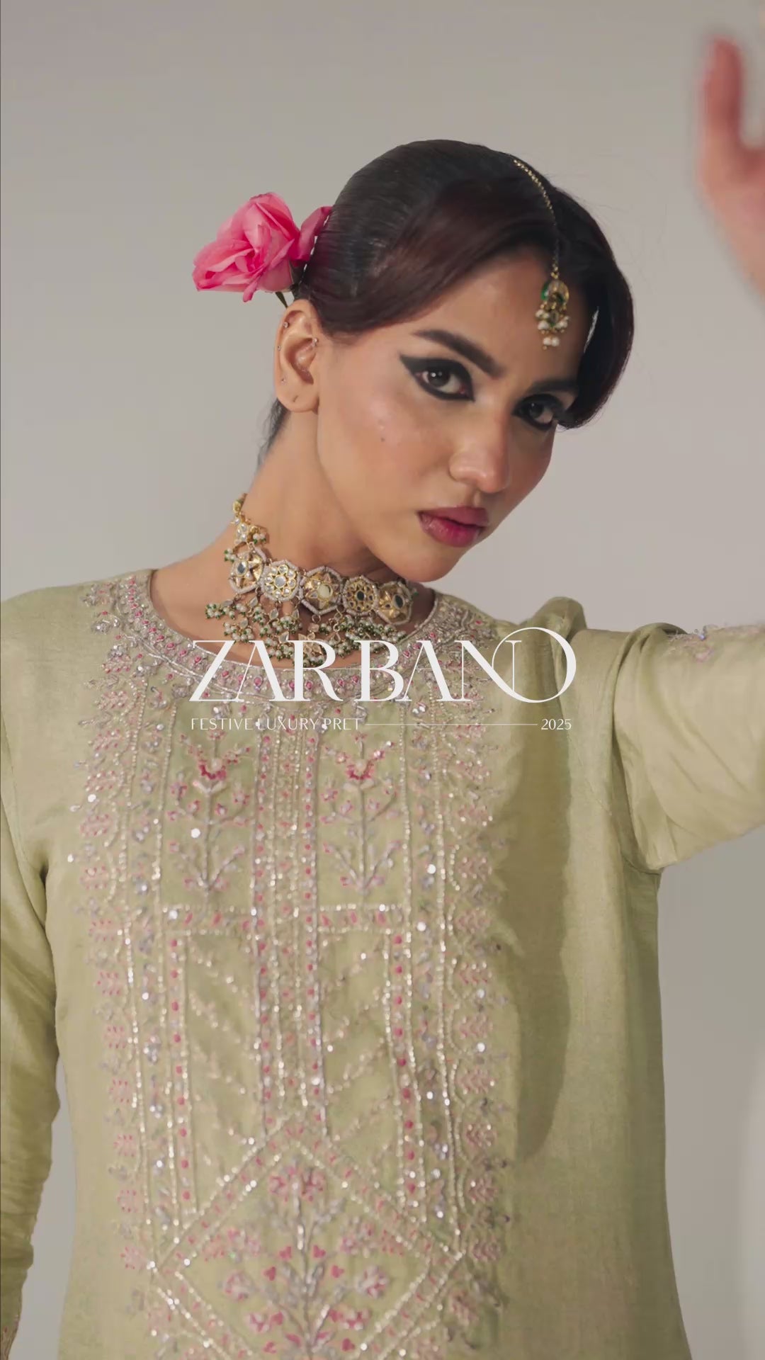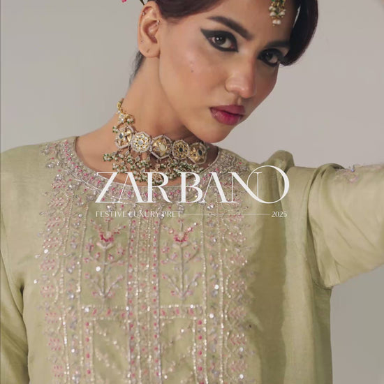 This light green ensemble features a rawsilk shirt adorned with blingy sequinned embroidery and intricate hand embellishments, radiating festive charm. It is paired with a sleek, plain trouser for a perfectly balanced look. The heavily embroidered organza dupatta, showcasing a dazzling floral jaal and an embroidered four-sided border, adds a touch of effortless glamour. Elevate your festive style by pairing it with a matching potli bag.
