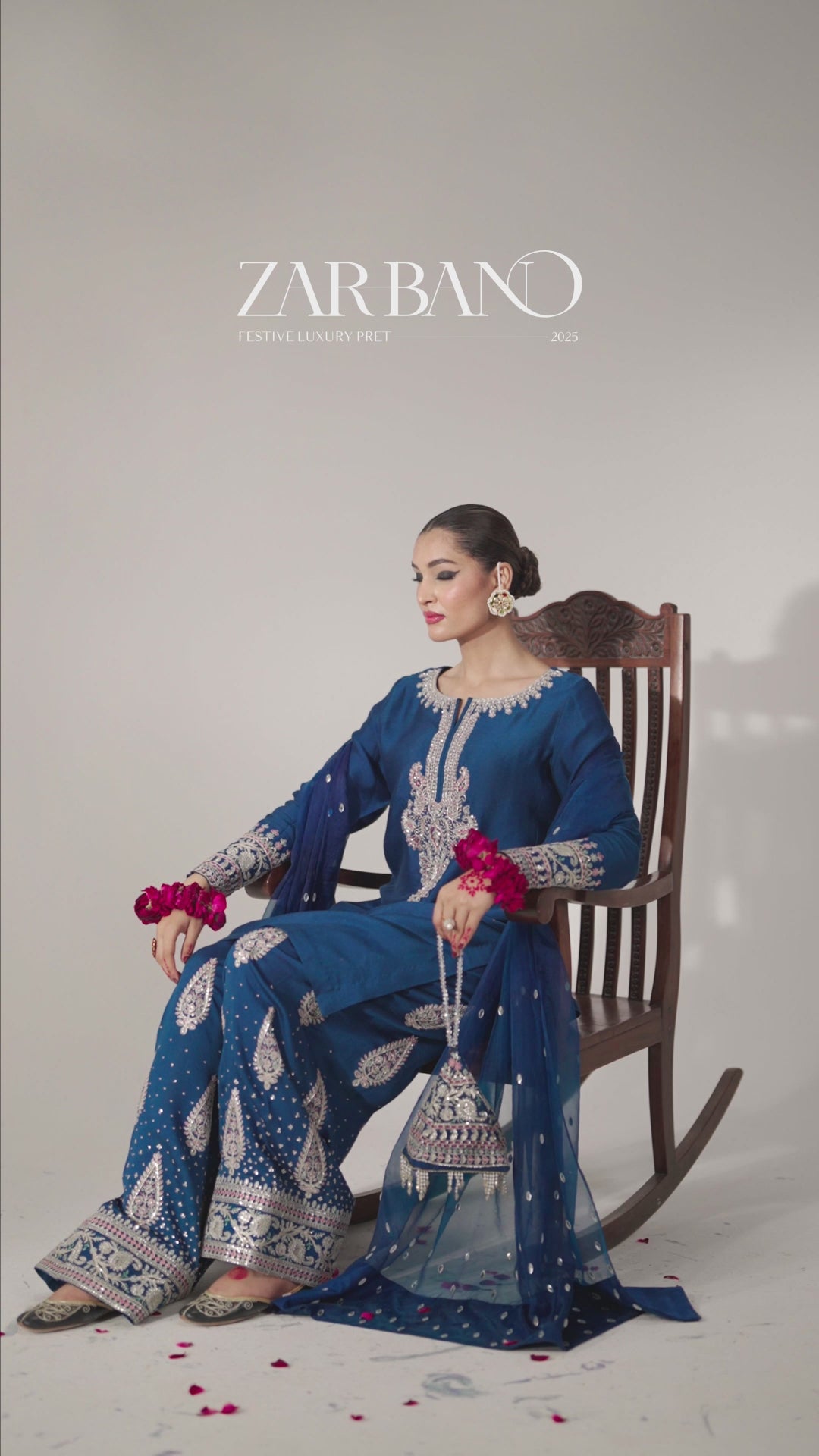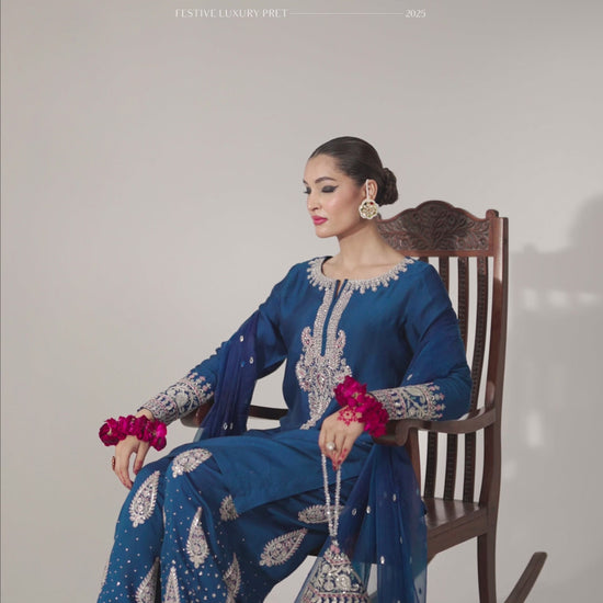 This yale blue farshi shalwar kameez set is crafted from luxurious Roman Silk, featuring a hand-embellished neckline and intricate embroidery. The farshi shalwar is adorned with traditional ethnic sequin embroidery. It comes with a matching organza dupatta, finished with silk and a dazzling diamante spray. A modern potli bag completes the look with a contemporary flair.