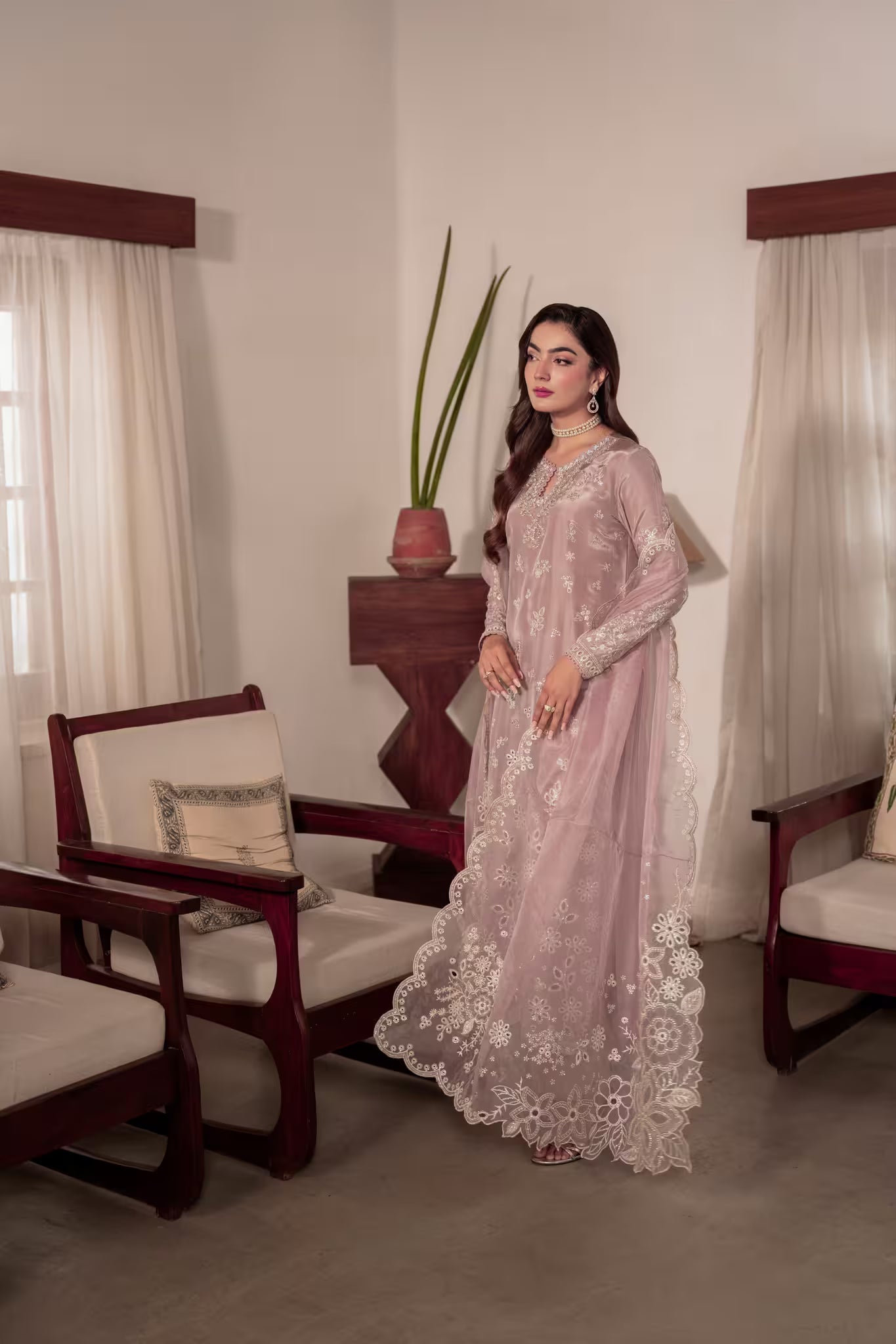 Paired with matching pants and an organza dupatta that is a true piece of art — featuring scalloped, sequin-embroidered borders and statement pallus adorned with floral bunches enhanced with sequins, cutwork, and schiffli — MAAVI embodies timeless sophistication and graceful charm.