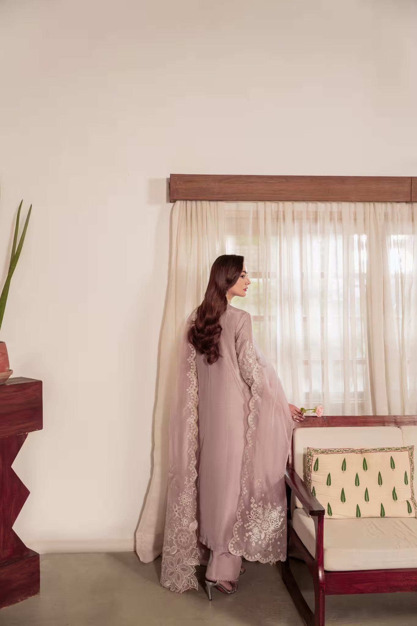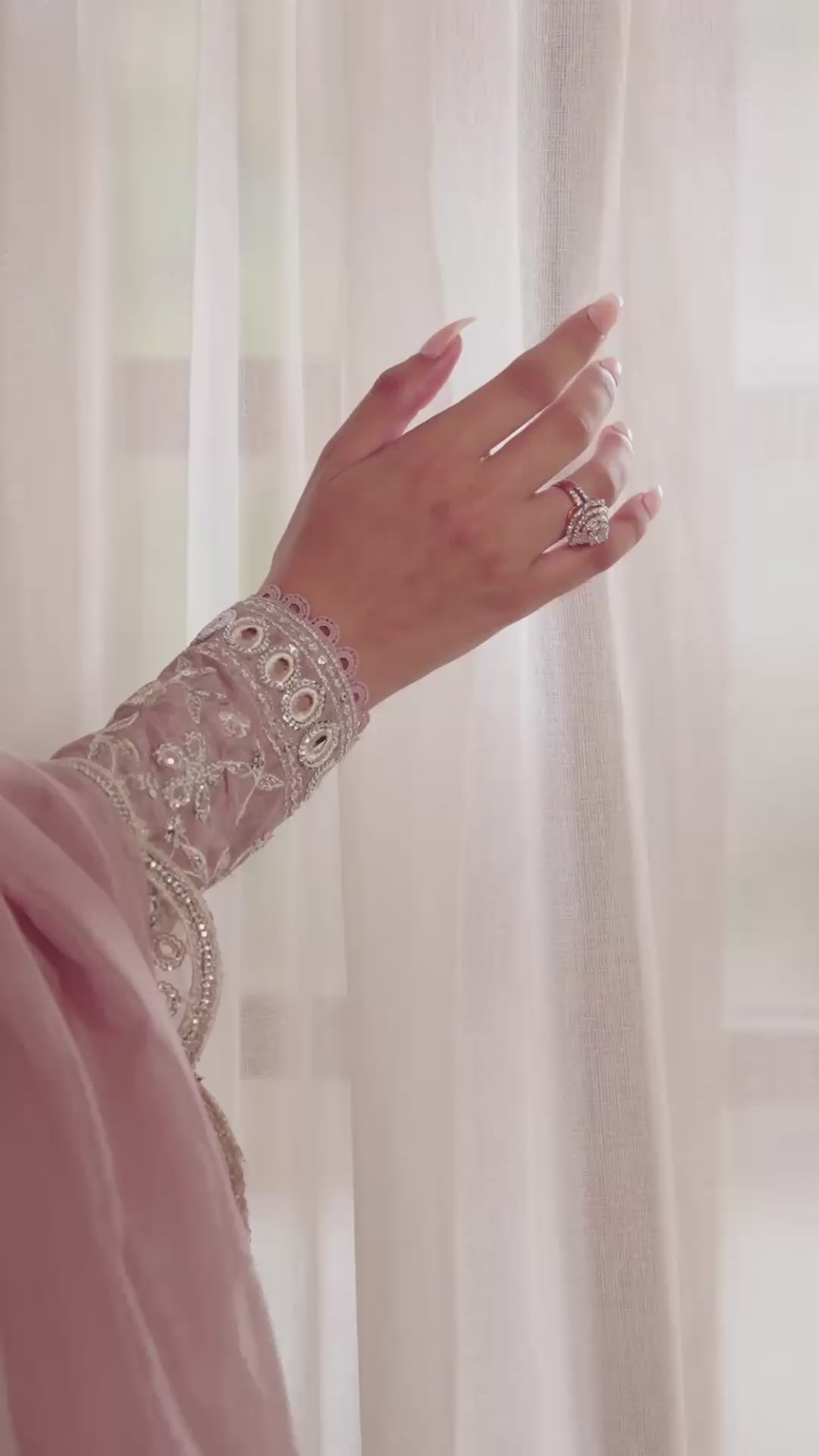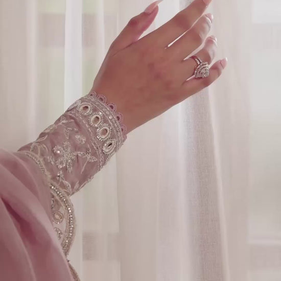 MAAVI is crafted from pure ramen silk in a soft dusty mauve hue, exuding delicate elegance. The shirt features a hand-embellished neckline adorned with crystals and sequins, complemented by floral and sequin embroidered cutwork on the sleeves and front, along with intricate lace detailing.