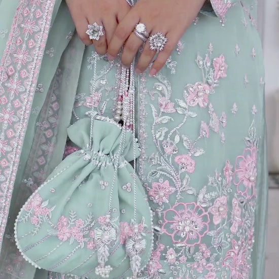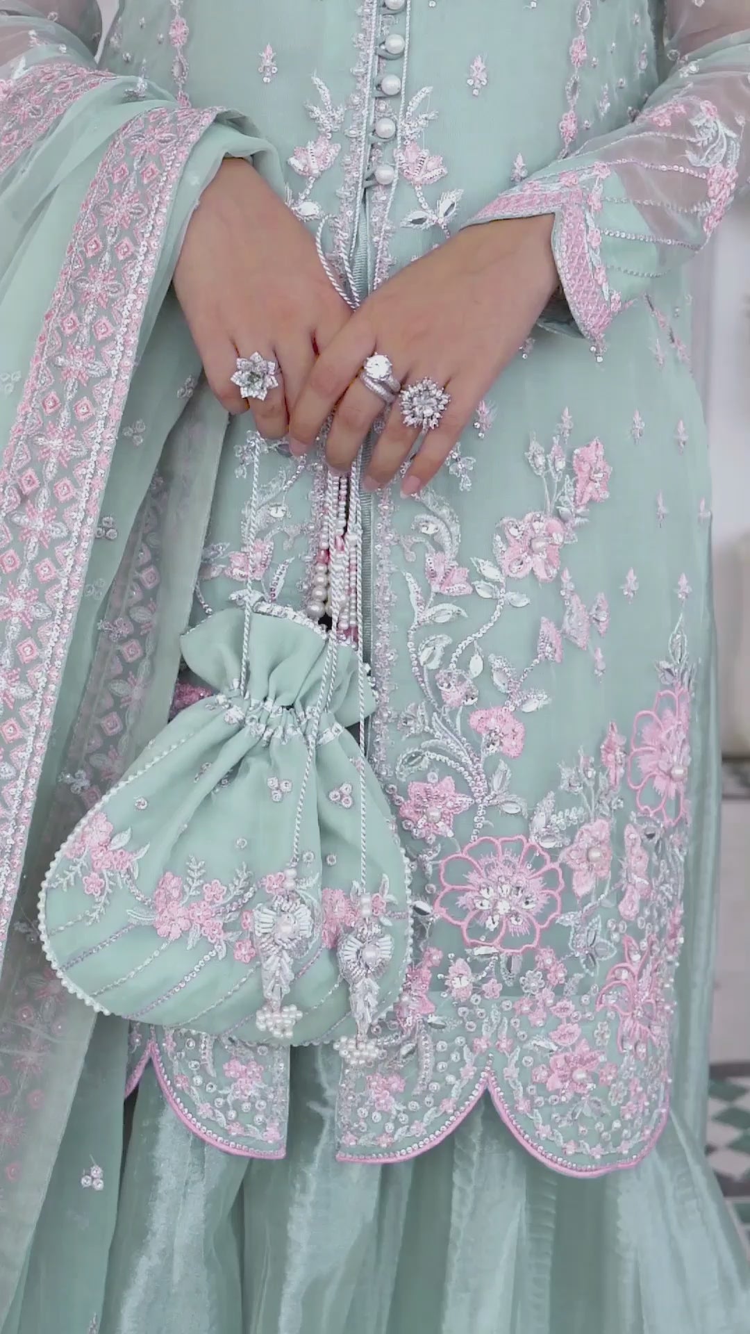 This delicate ice blue sharara set comprises of an embroidered and hand-embellished front-open lined organza shirt adorned with crystals, pearls, Swarovski’s and sequins along with resham and chandi tilla. It's topped off with hand-crafted delicate tassels hanging down the neckline.