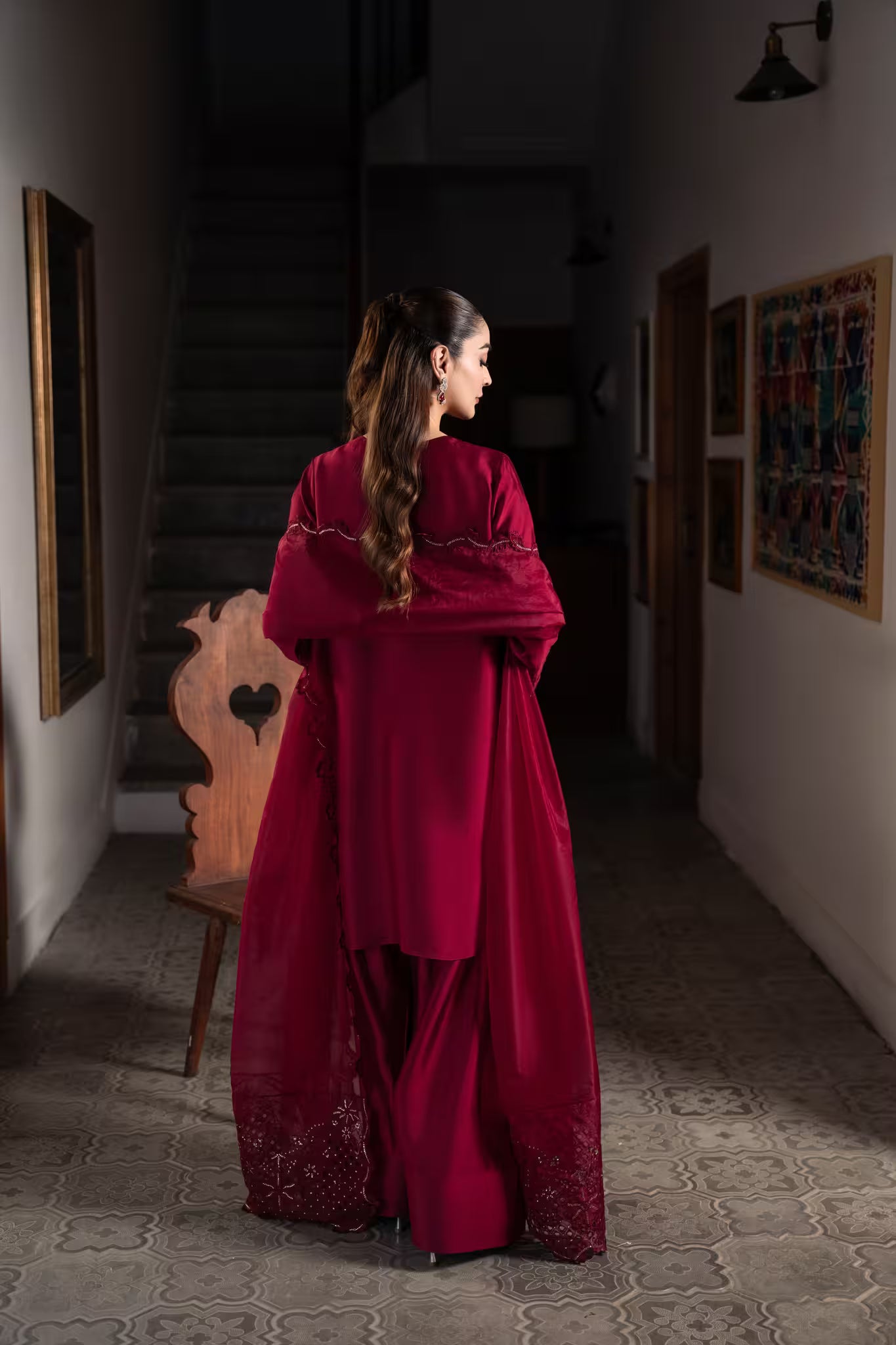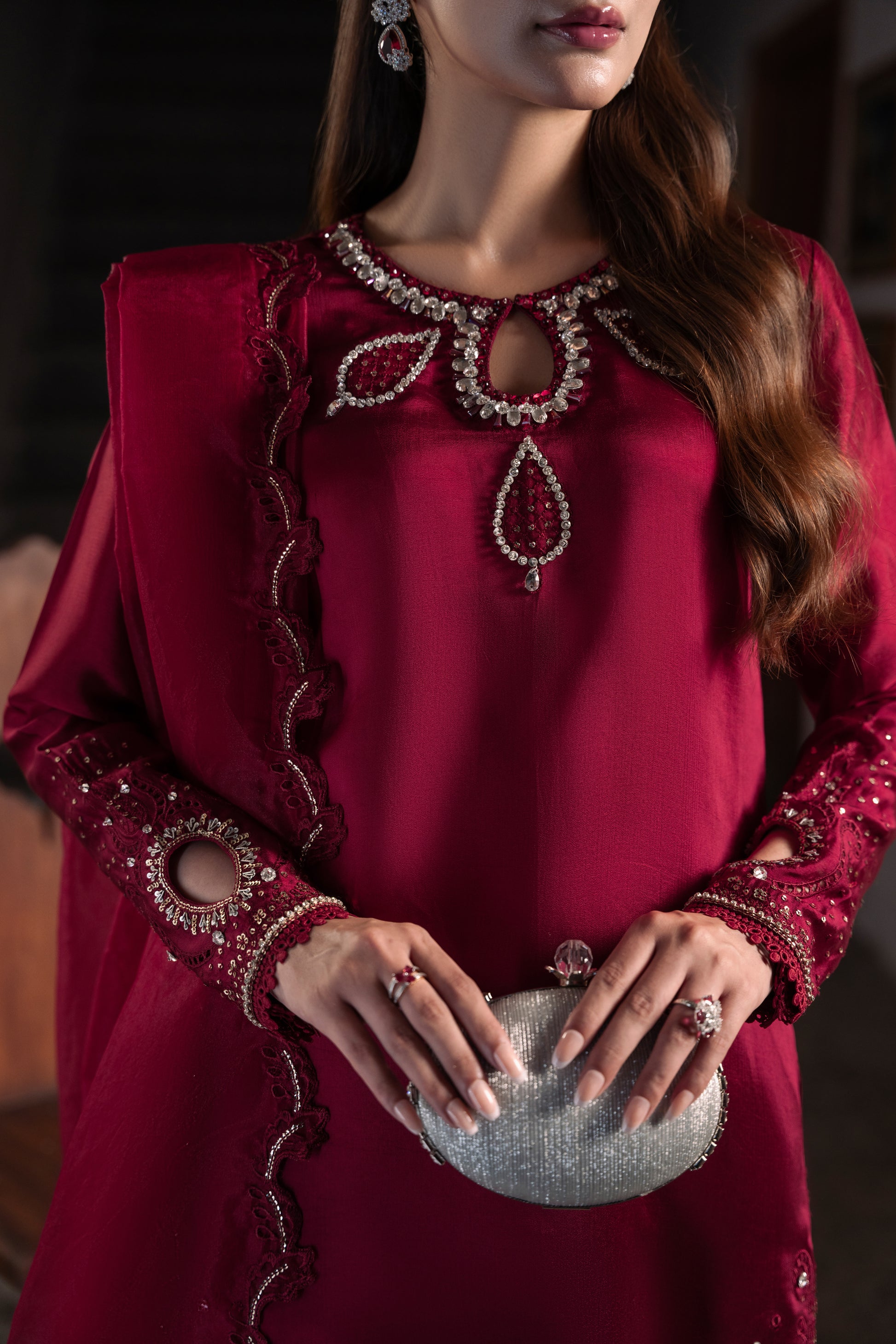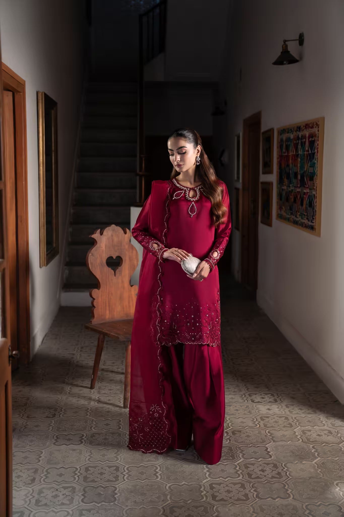 ROSETTE is crafted from pure shisha silk in a rich wine-cherry hue, exuding regal sophistication. The shirt features hand-embellished neckline, sleeves and hem, adorned with crystals, sequins, dabka and beads. The hem also features intricate embroidery and cutwork detailing.