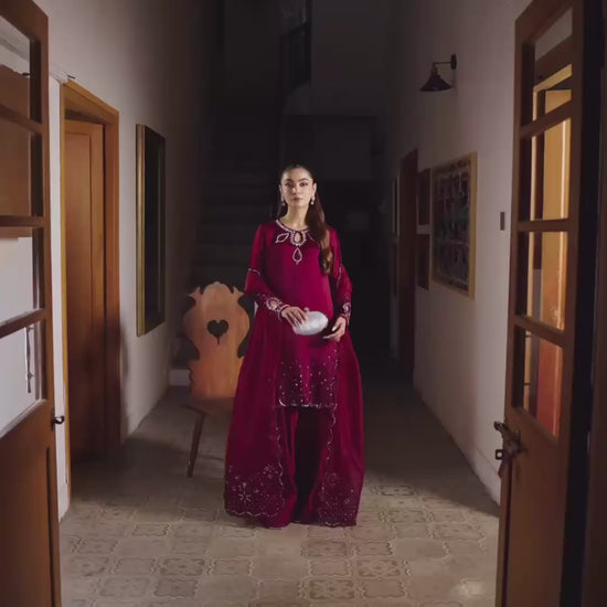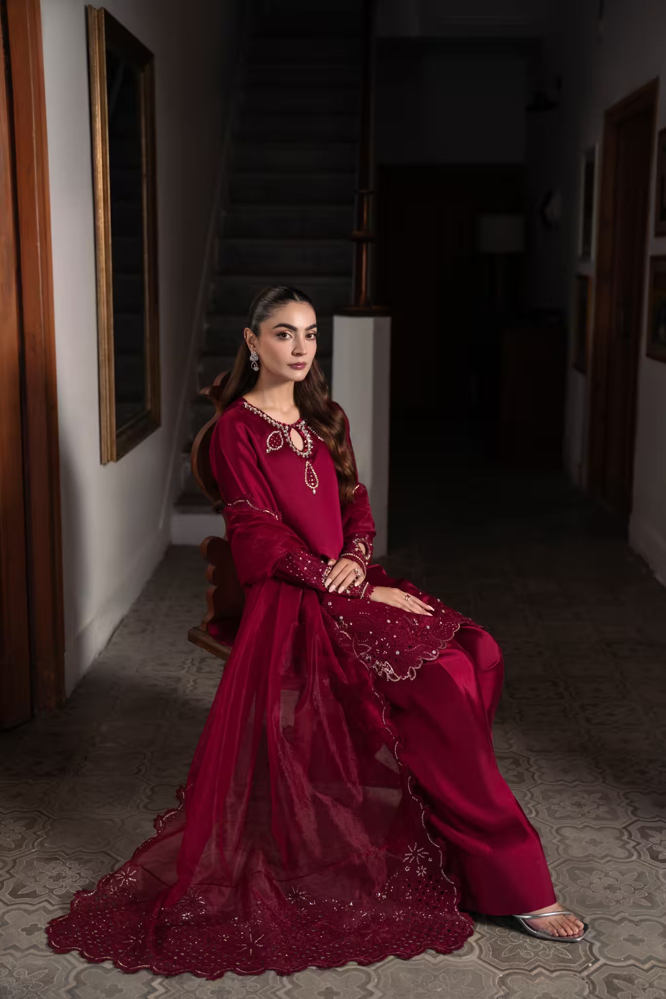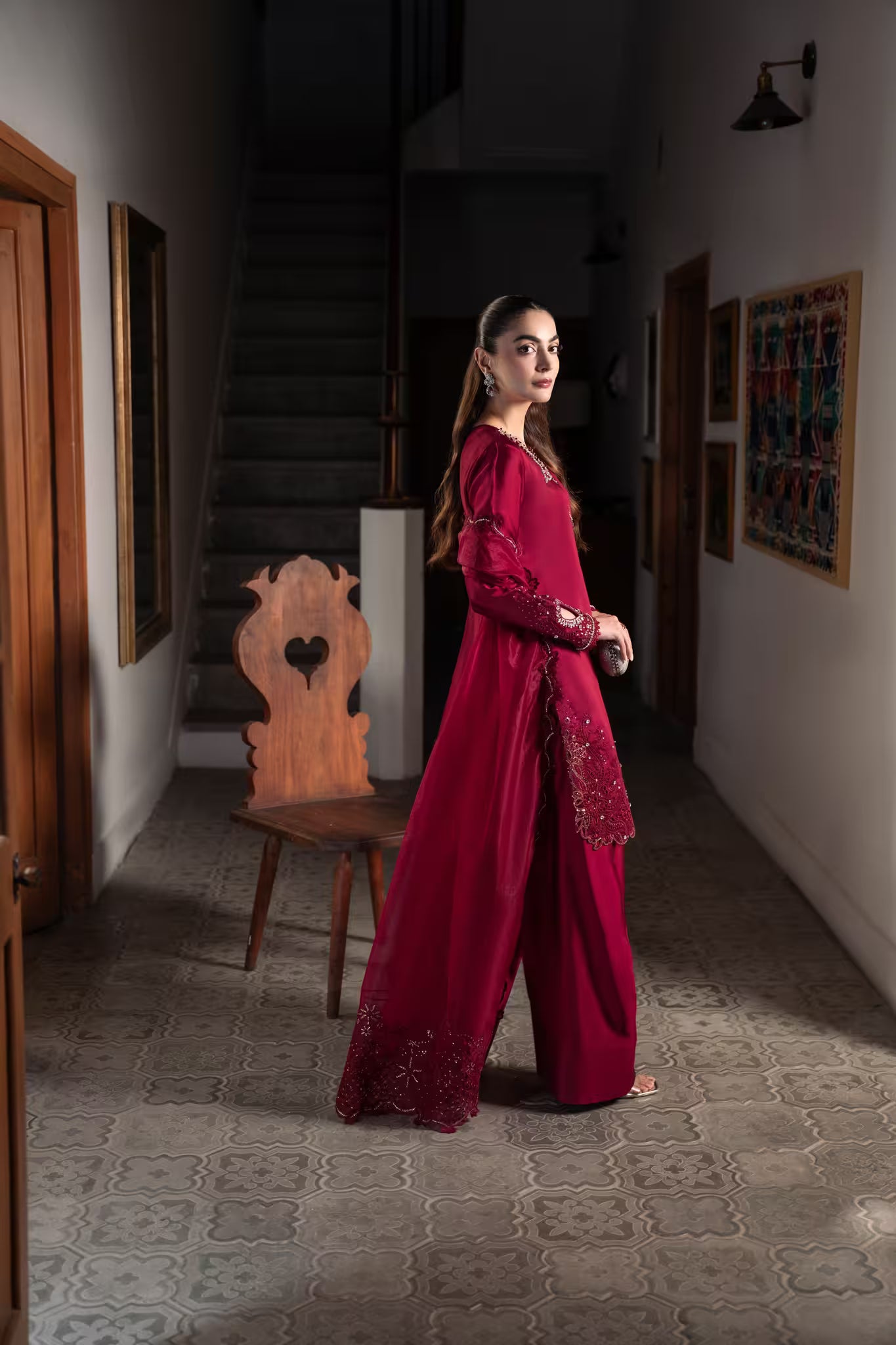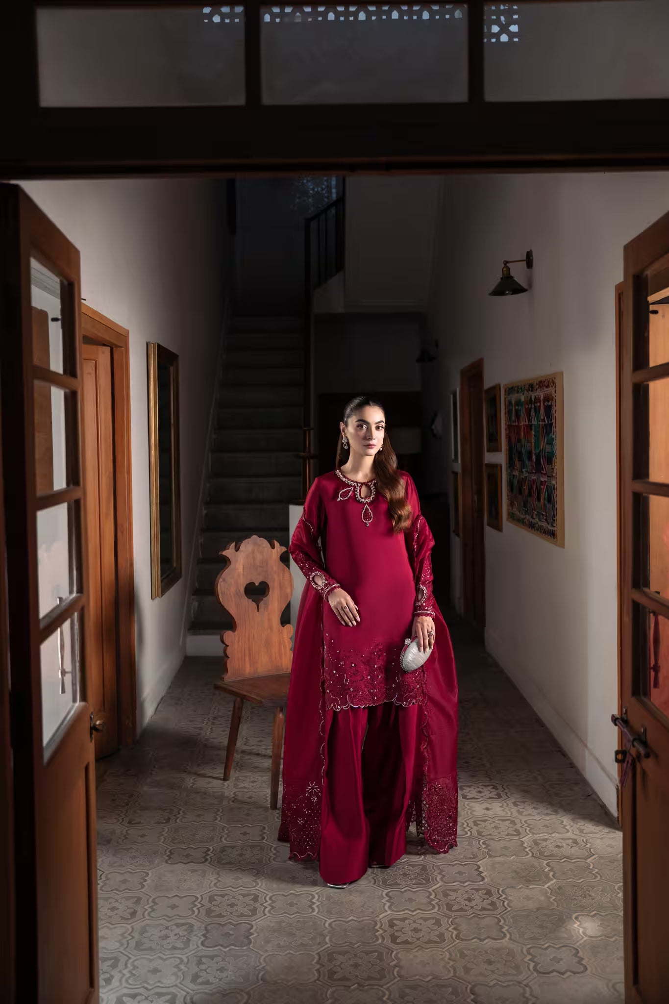 ROSETTE is crafted from pure shisha silk in a rich wine-cherry hue, exuding regal sophistication. The shirt features hand-embellished neckline, sleeves and hem, adorned with crystals, sequins, dabka and beads. The hem also features intricate embroidery and cutwork detailing.