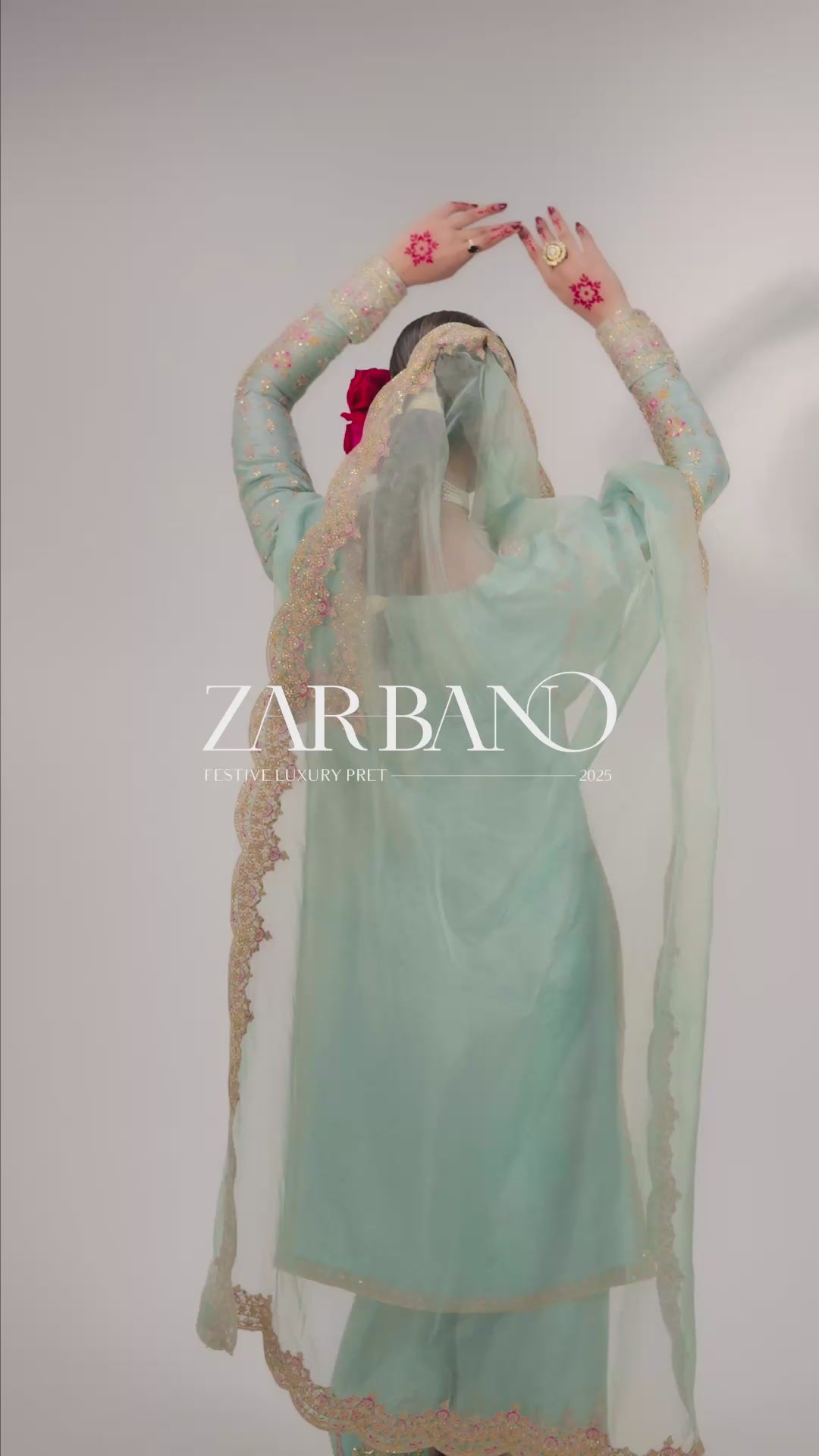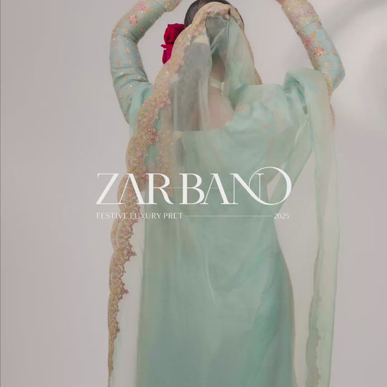This stunning Pale Turquoise ensemble features a rawsilk shirt with hand embellishment and rich embroidery. It is paired with embroidered pants and an organza dupatta with four-sided scalloped embroidered borders. Add a matching potli bag to complete your festive look.
