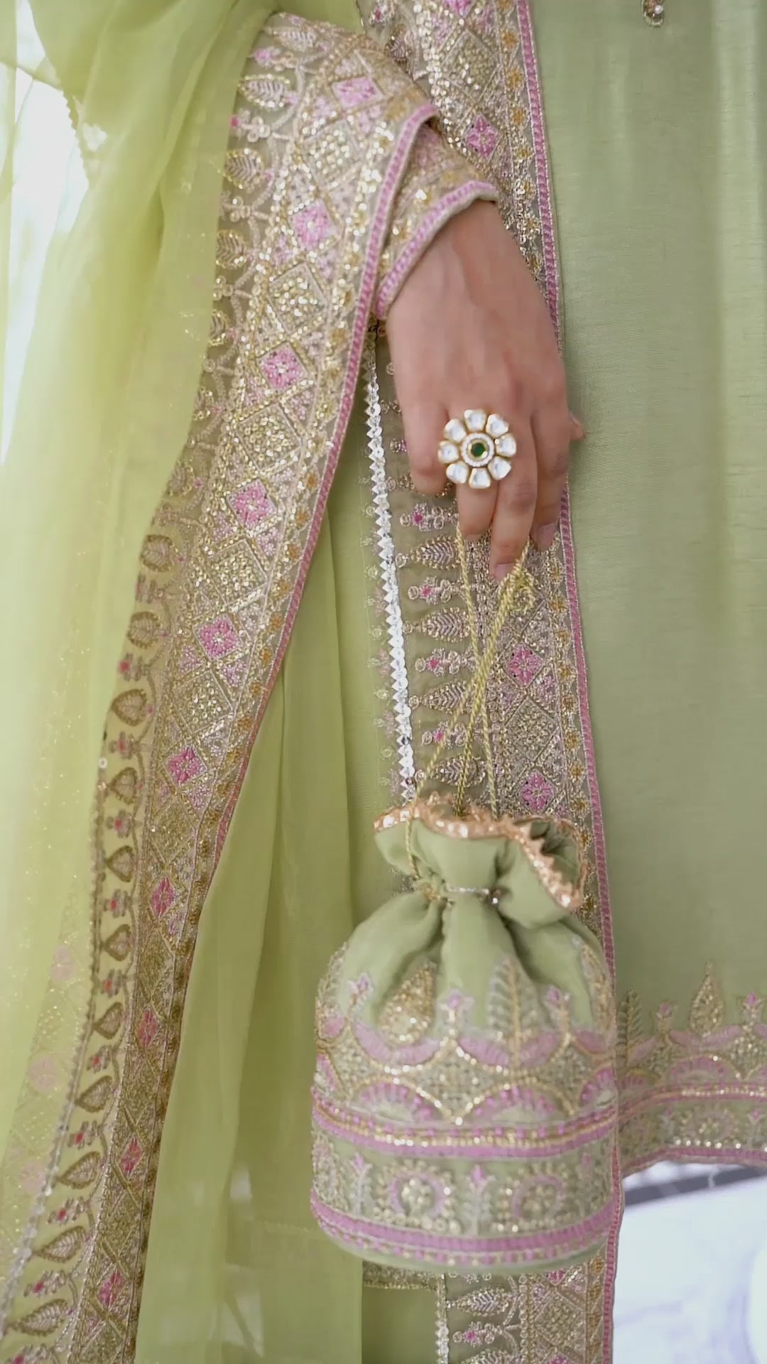 - Dupatta: Organza dupatta with embroidered & sequined borders and pallus