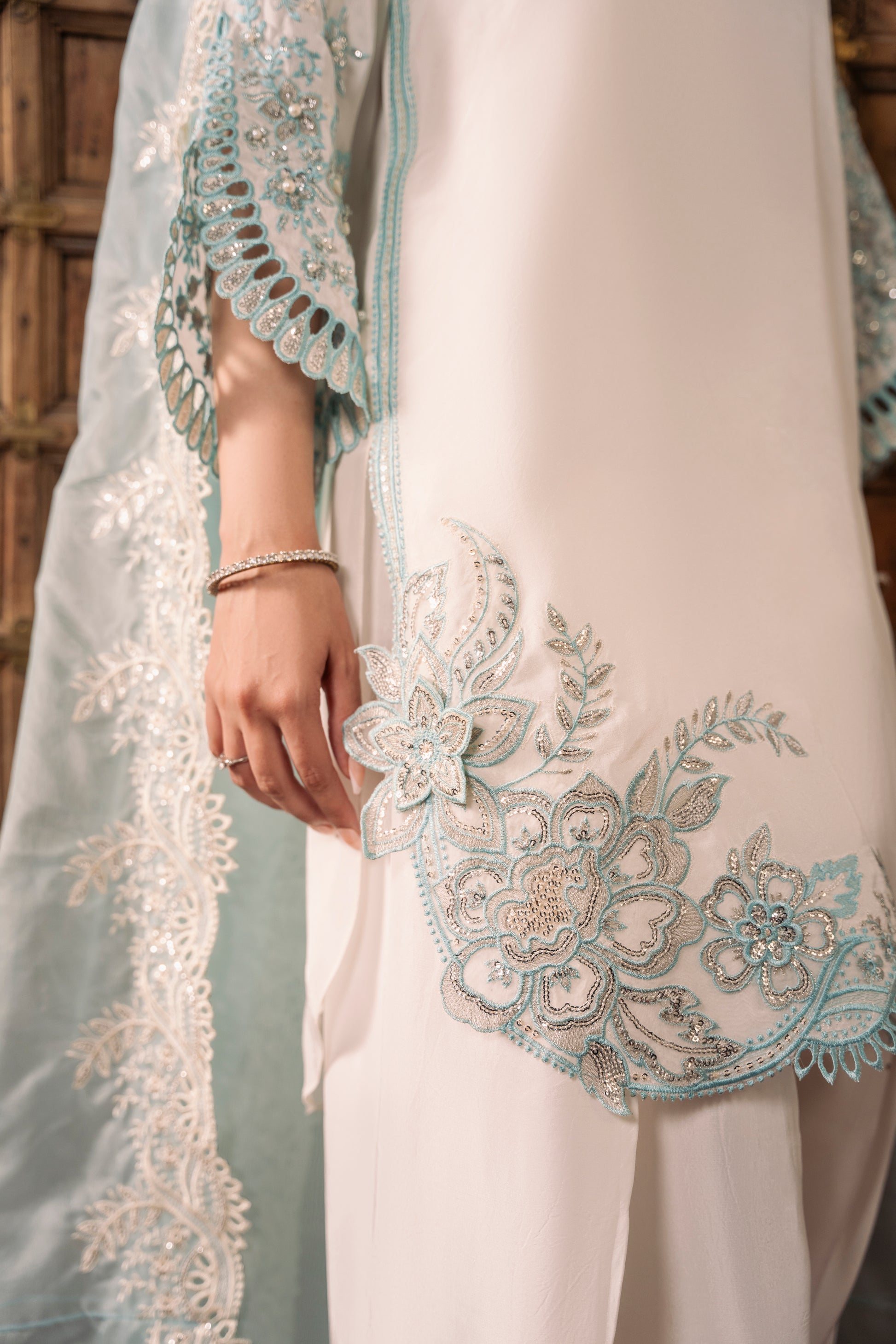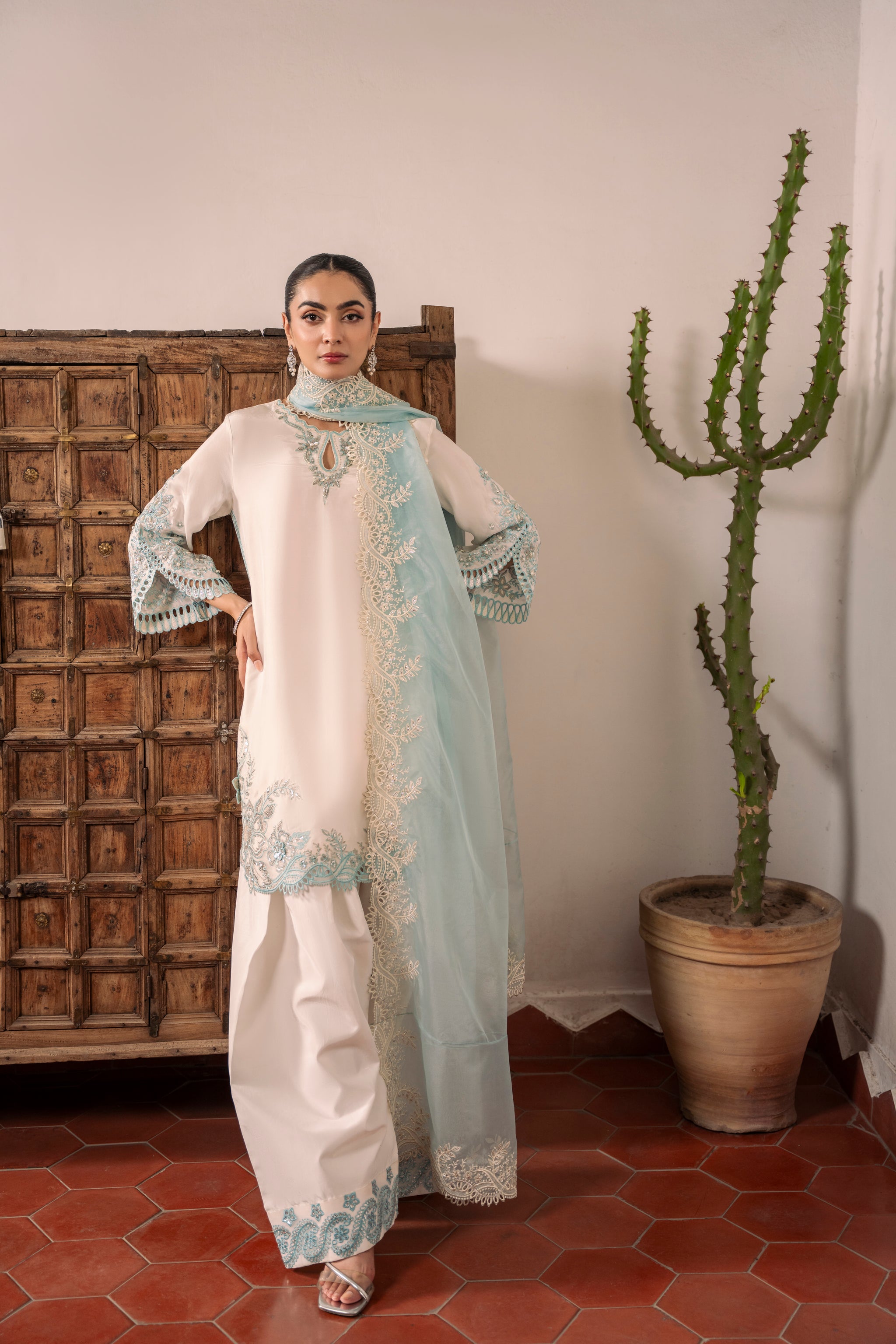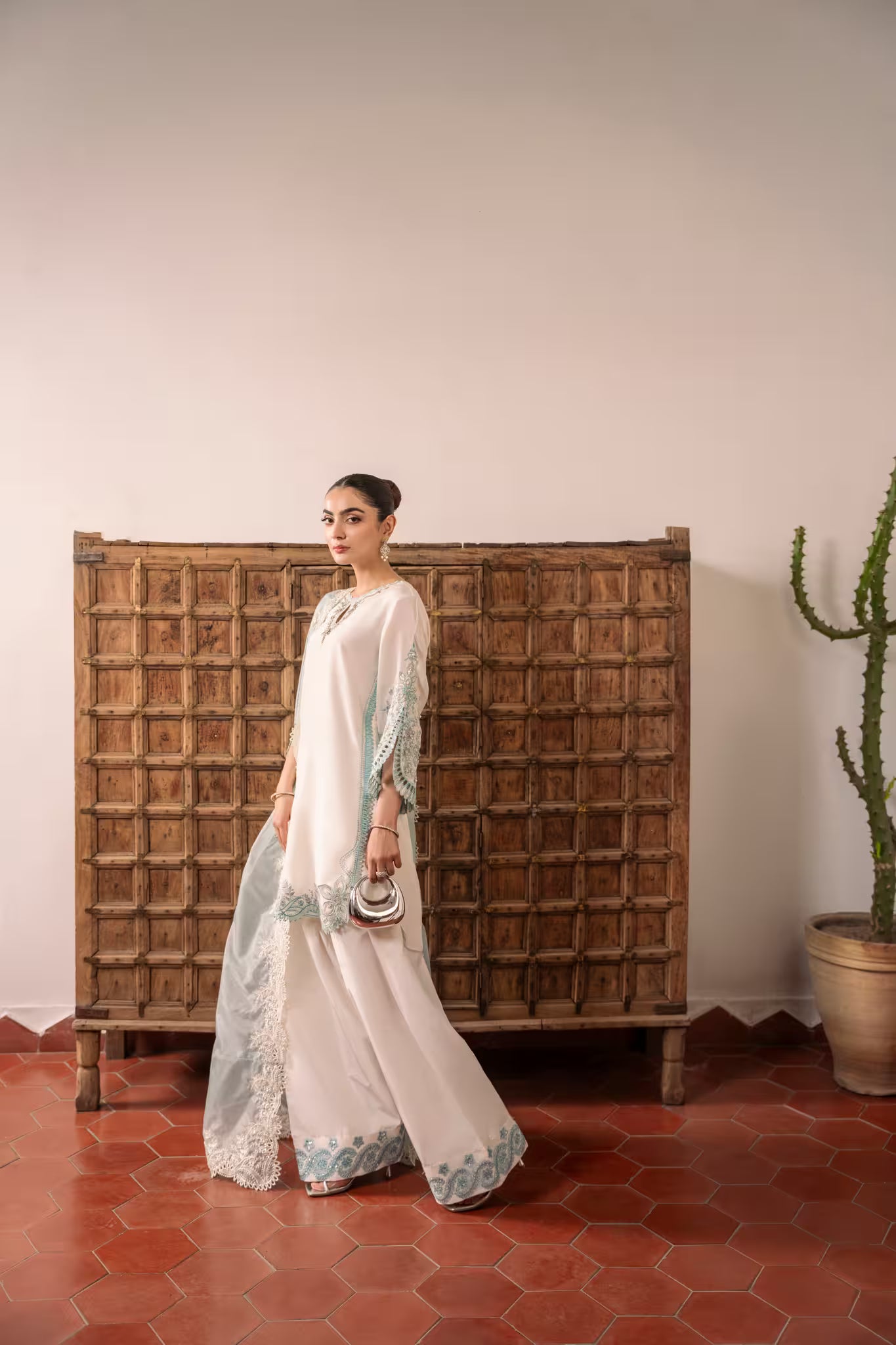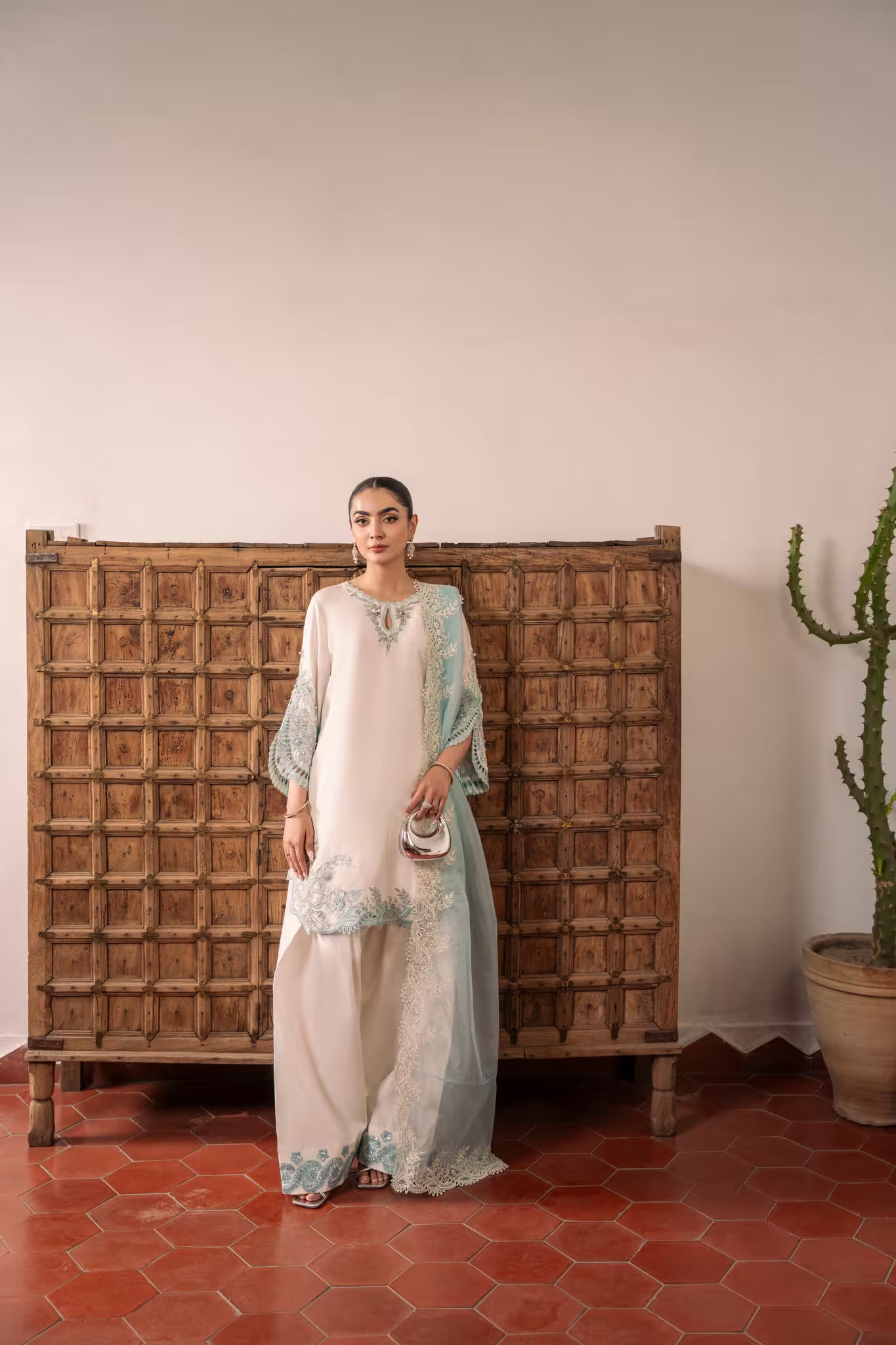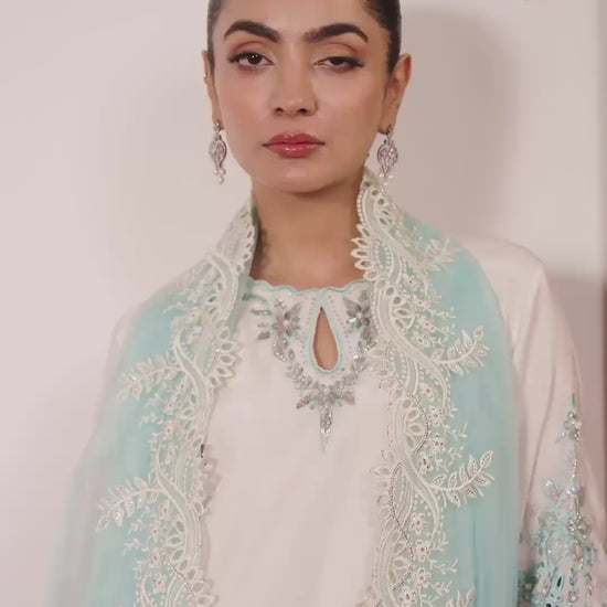 Paired with a matching fused farshi shalwar featuring embroidered and sequined hems, and a contrasting powder blue organza dupatta with scalloped, sequin-embroidered borders and intricate cutwork — TWINKLE is a luminous ensemble that captures timeless sophistication and grace.