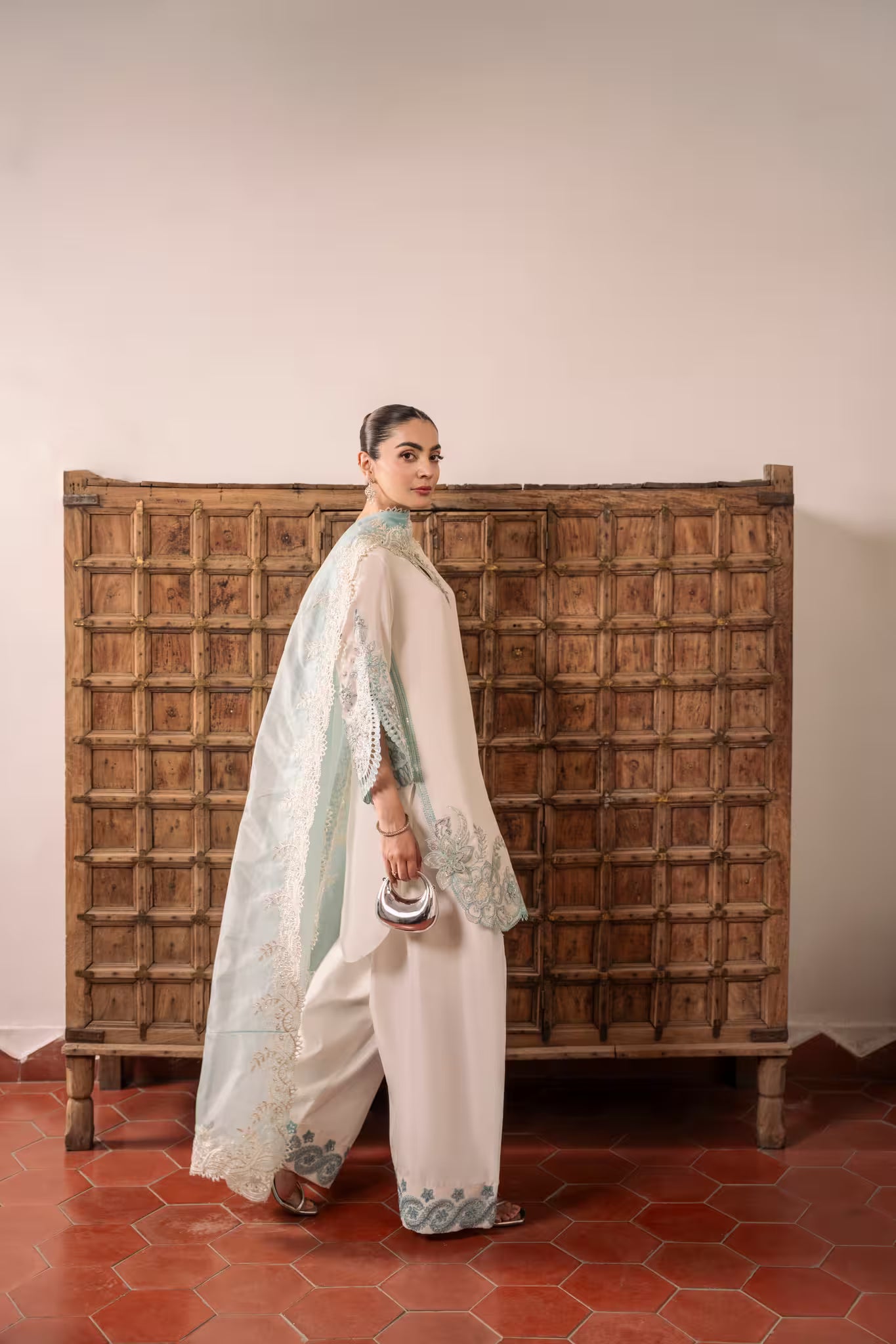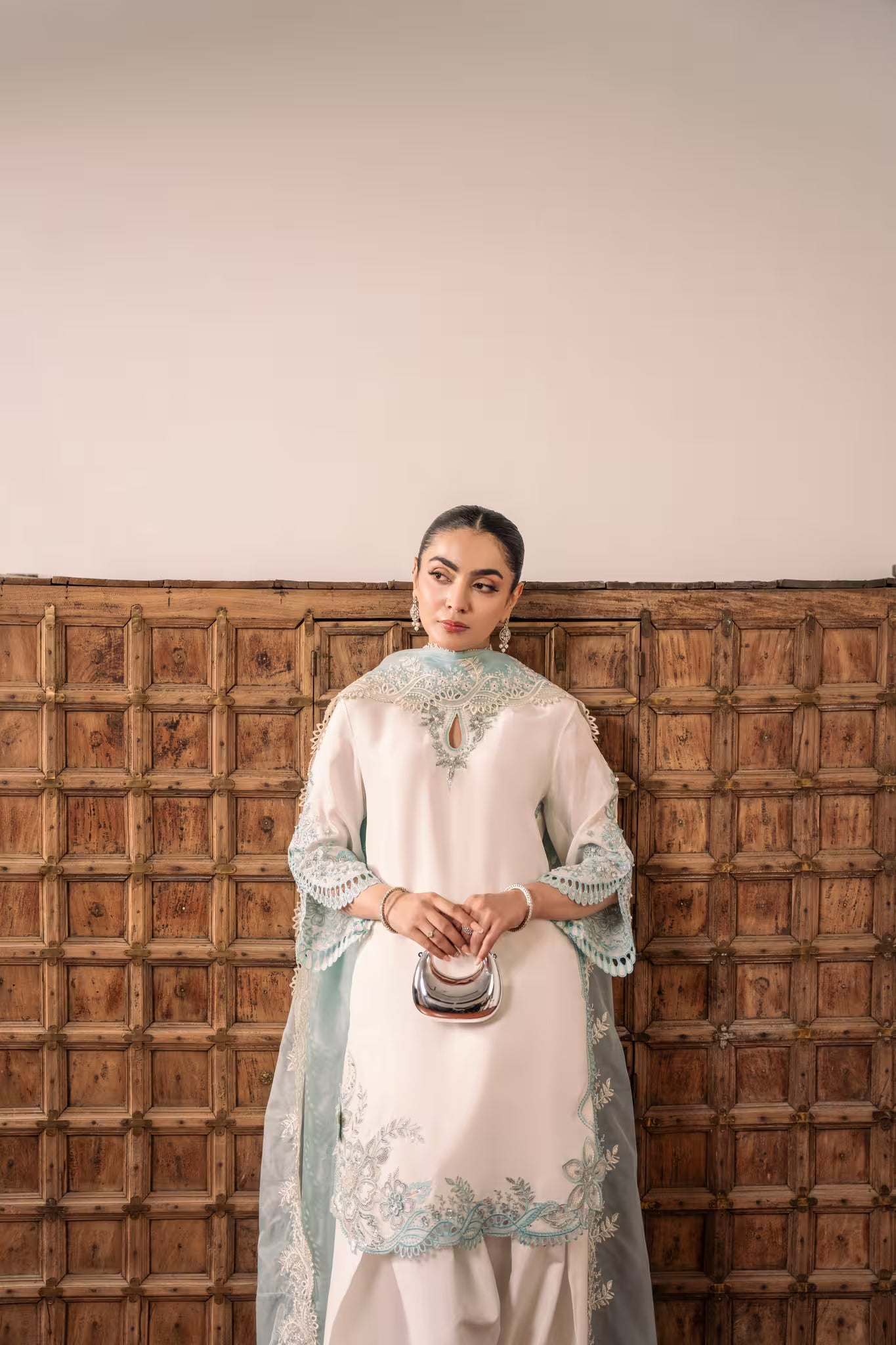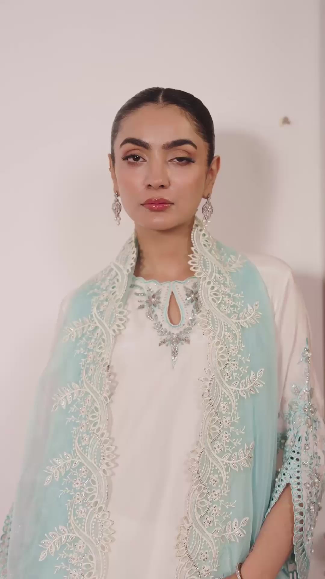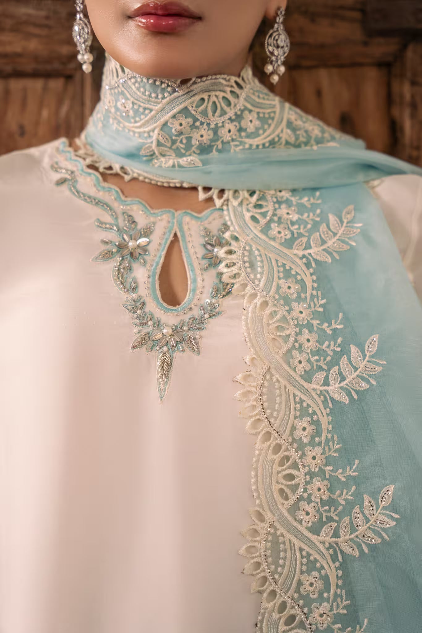 Paired with a matching fused farshi shalwar featuring embroidered and sequined hems, and a contrasting powder blue organza dupatta with scalloped, sequin-embroidered borders and intricate cutwork — TWINKLE is a luminous ensemble that captures timeless sophistication and grace.
