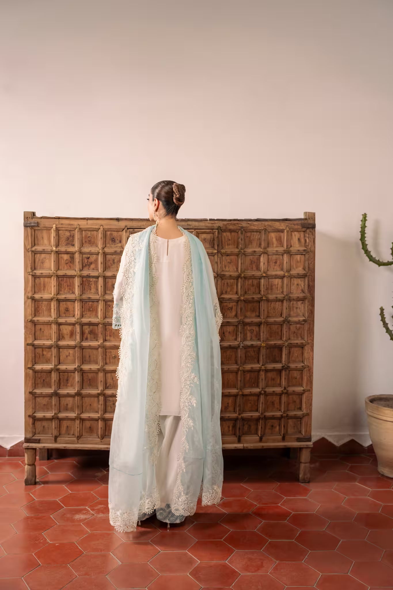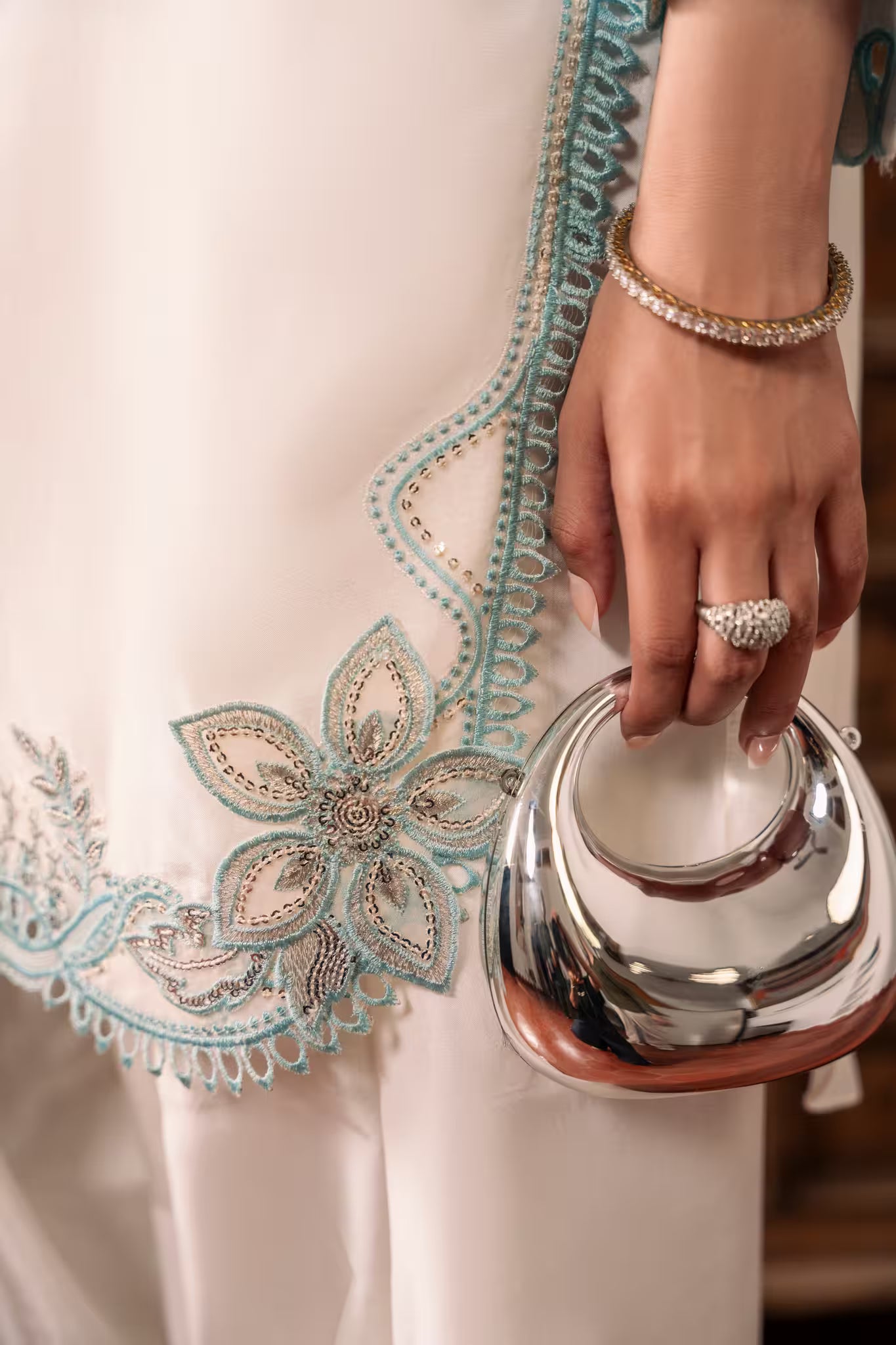 - Dupatta: Organza dupatta with scalloped borders, cut-work and sequin embroidery