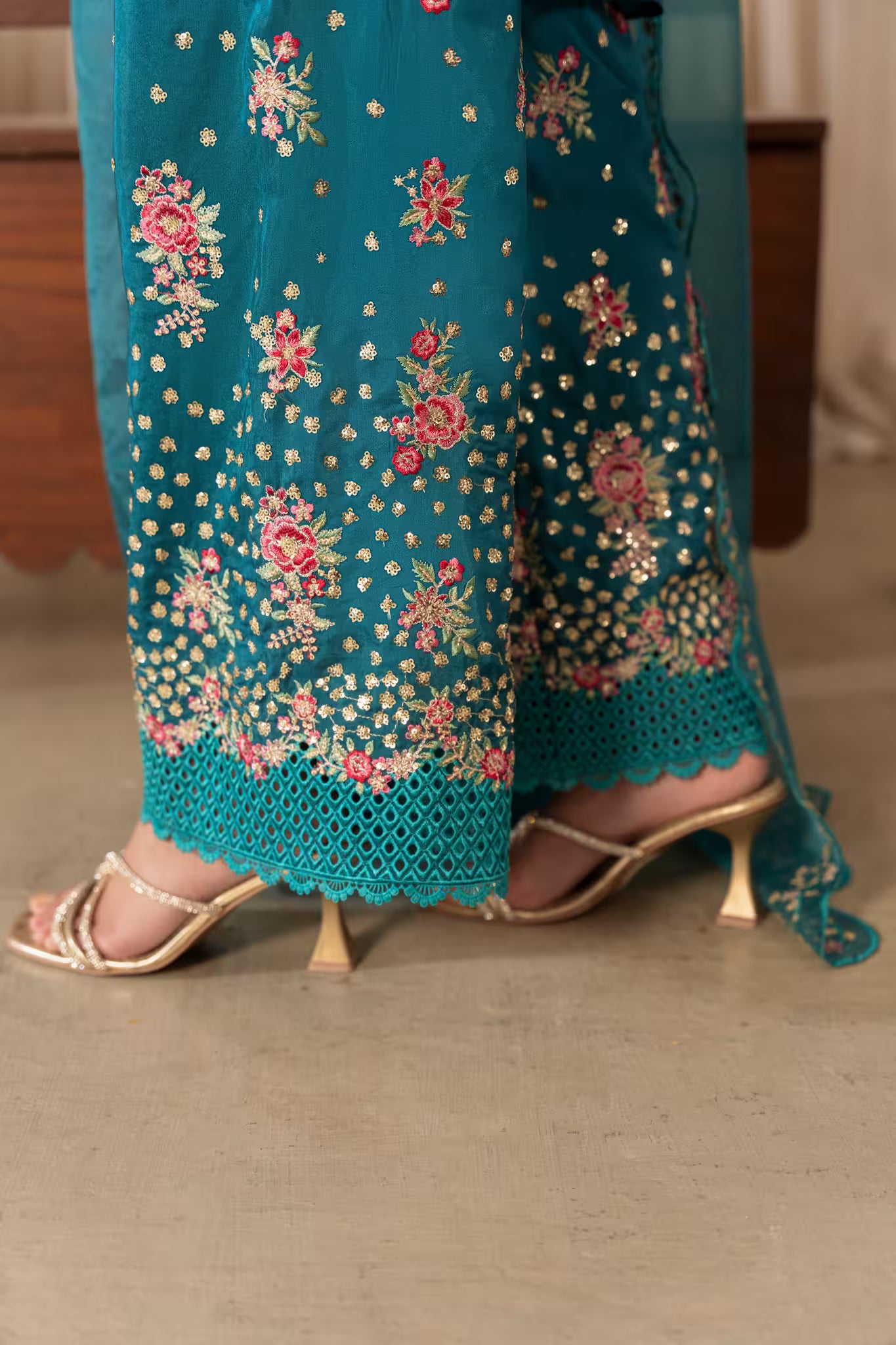 - Dupatta: Organza dupatta with scalloped borders and sequinned embroidery